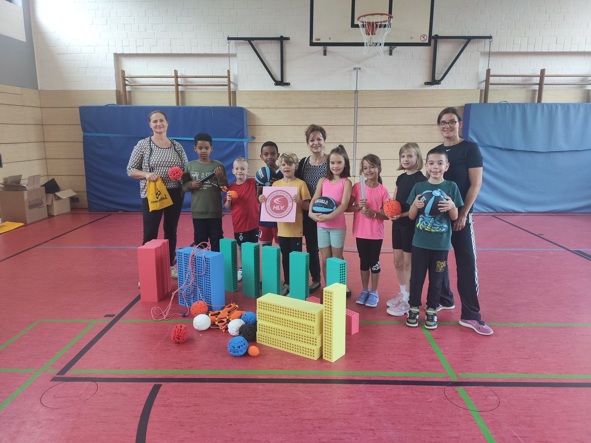 Am zweiten Trainingstag, am 17.09.2024, konnten die Vertreter des TV Friedrichstein, Jutta Mogk (Abteilungsleiterin Leichtathletik) und Hans-Jürgen Kramer (Geschäftsführer) den ansprechenden Gewinn im Beisein der Schulleitung, Frau Ines Franke, an die Kinderleichtathletik-AG übergeben. Mit Begeisterung brachten die Kinder sofort gemeinsam mit ihrer Trainerin Melanie Kellner die neuen Sportgeräte für unterschiedliche Bewegungsaufgaben zum Einsatz. Teil des Materialpakets waren auch das Gütesiegel des HLV, das die Grundschule Helenentalschule nun sichtbar als Kooperationsschule kennzeichnet sowie ein vielfältig einsetzbares Übungskartenset für den Bundesjugendspiel-Wettbewerb und methodische Handreichungen für die Leichtathletik in der Schule.