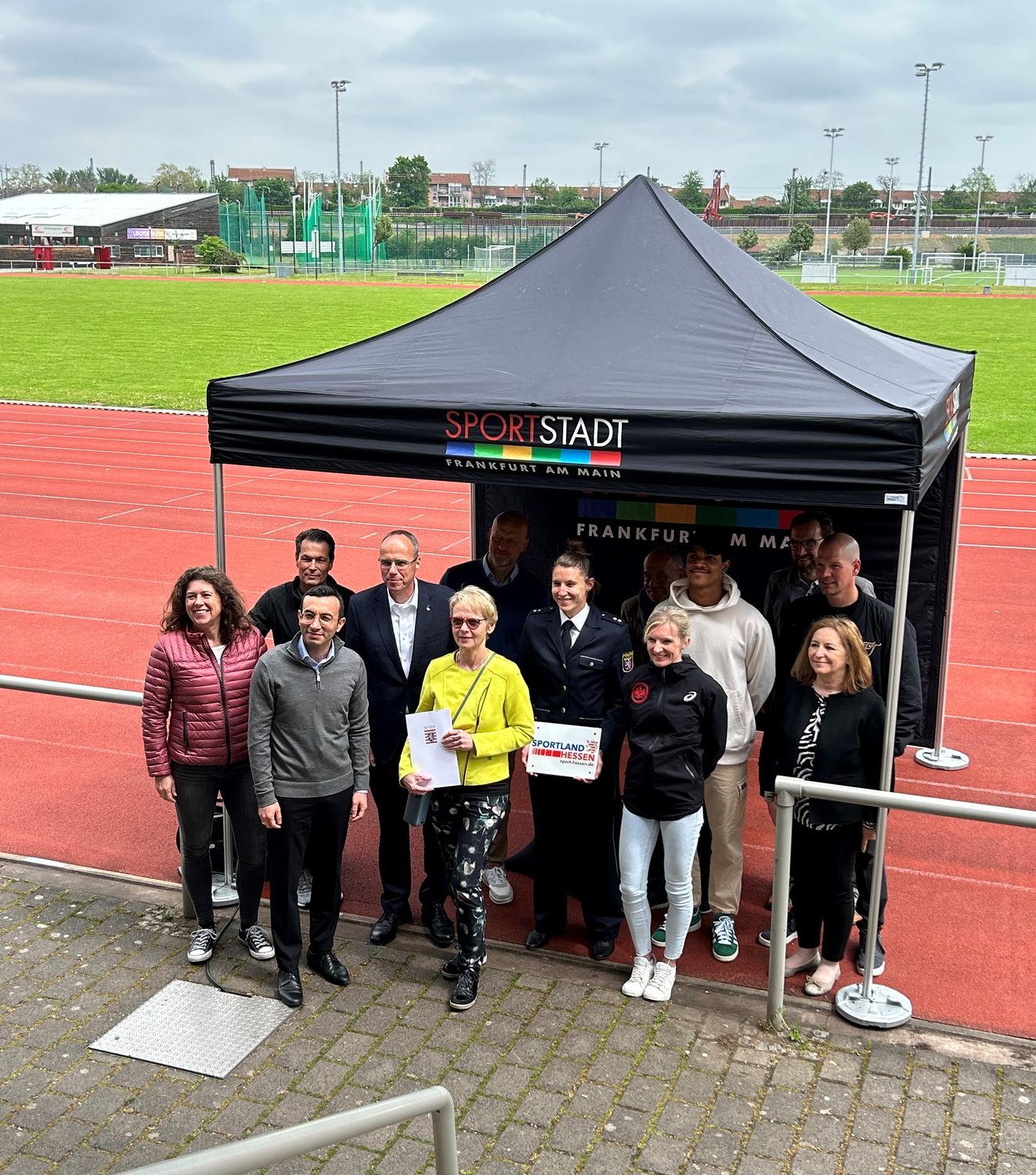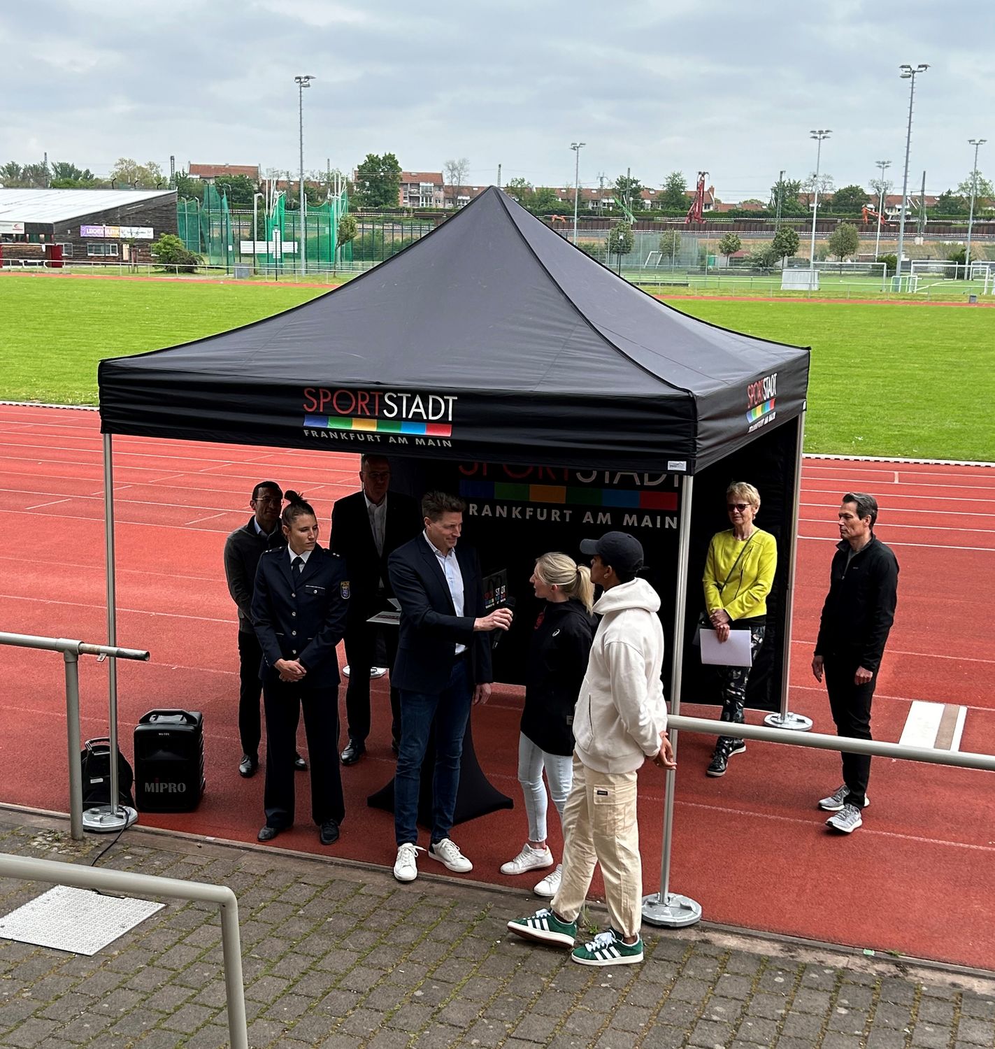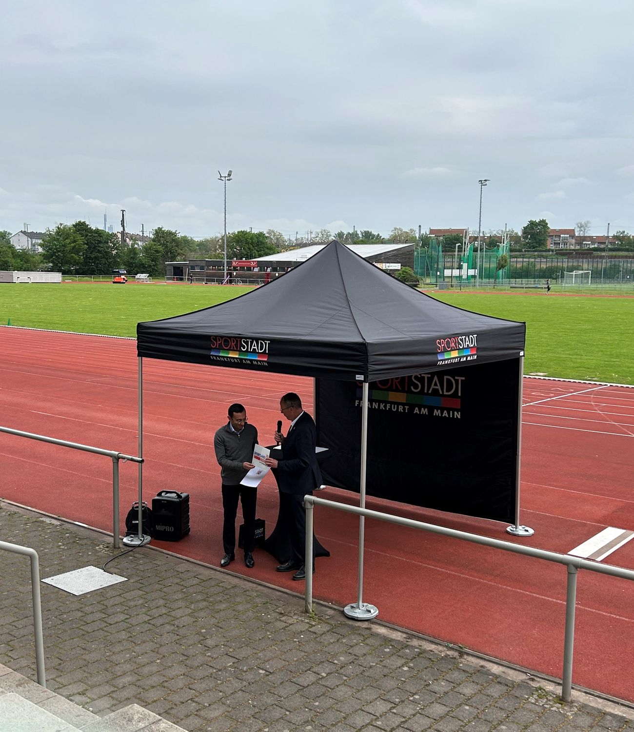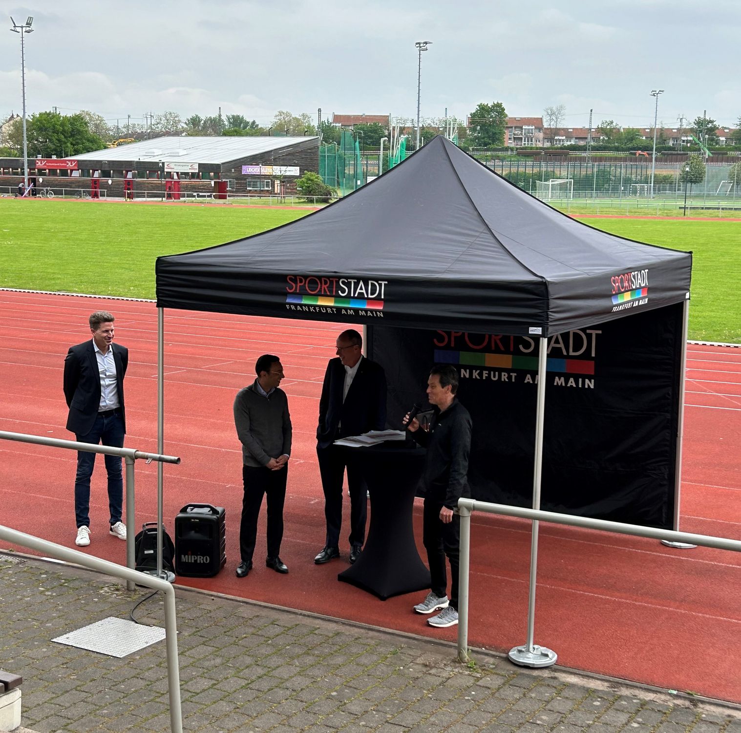 Bei der Pressekonferenz am Montag, den 08.05. übergab Peter Beuth, Hessischer Minister des Innern und für Sport, den Zuwendungsbescheid über insgesamt 1,5 Millionen Euro für den geplanten Umbau des Bundesstützpunktes Leichtathletik an den Sportderzernent und baldigen Oberbürgermeister der Stadt Frankfurt, Mike Josef. Auch HLV-Präsident Klaus Schuder war vor Ort und bedankte sich im Namen der hessischen Leichtathletik für die Unterstützung und den Bescheid.