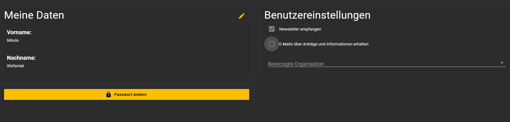 Wer E-Mails von lanet3 bezüglich Änderung des Genehmigungsstatus seiner Veranstaltung erhalten möchte, muss oben rechts auf den Kreis mit seinen Initialien klicken. Unter „Profil“ gibt es die Möglichkeit den Haken bei „E-Mails über Anträge und Informationen erhalten“ zu setzen (siehe Datei rechts).