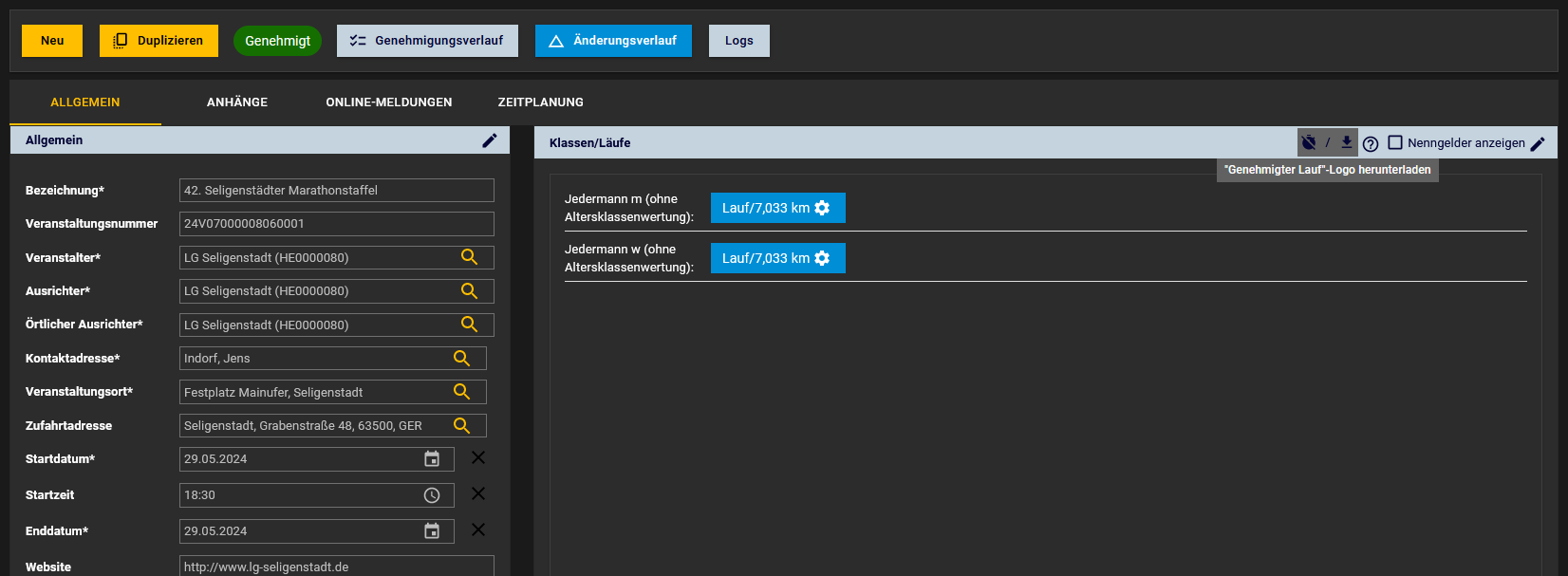 Ist möglich, sobald die Veranstaltung in lanet3 genehmigt wurde. Hierzu einfach auf den Button „Genehmigter Lauf – Logo“ bzw. „Vermessener Lauf – Logo“ herunterladen in der rechten Ecke klicken (siehe Datei rechts). Die Logos werden in verschiedenen Formaten heruntergeladen.
