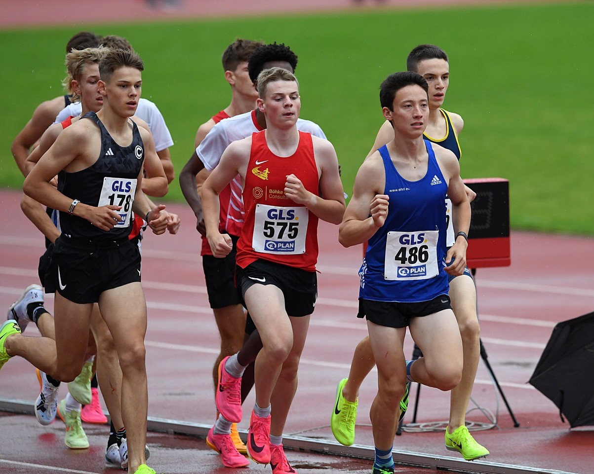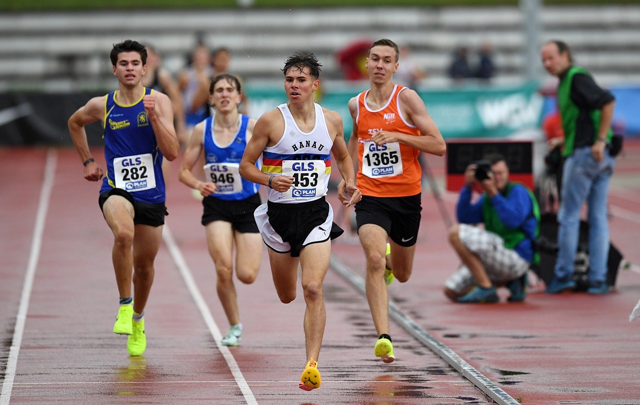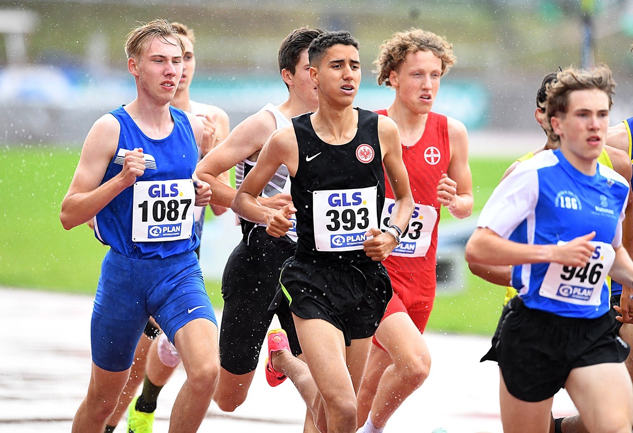 1.500 Meter: Es war eine wahre Regenschlacht. Schon als die Athleten ins Stadion geführt wurden, hatte der Himmel seine Schleusen geöffnet. Im ersten Rennen war auch Tristan Kaufhold mit dabei. Der Jahresbeste (3:50,92 min.) vom SSC Hanau-Rodenbach lief lange mitten im Feld mit und tat auf den letzten 300 Metern nicht mehr als nötig. Das sparte Kräfte und reichte, um als Vorlaufsieger mit eher lockeren 4:11,73 Minuten sicher ins Finale zu kommen. Etwas schneller war das zweite Rennen gestrickt, in dem sich Ayoub Jaafar (Eintracht Frankfurt) als Dritter mit 4:08,76 Minuten ebenfalls das Endlauf-Ticket sicherte.