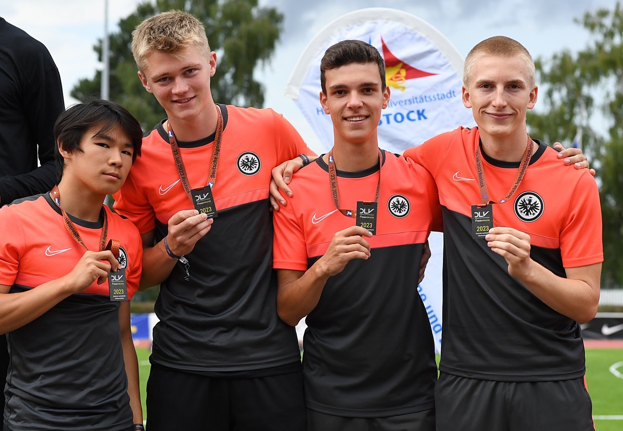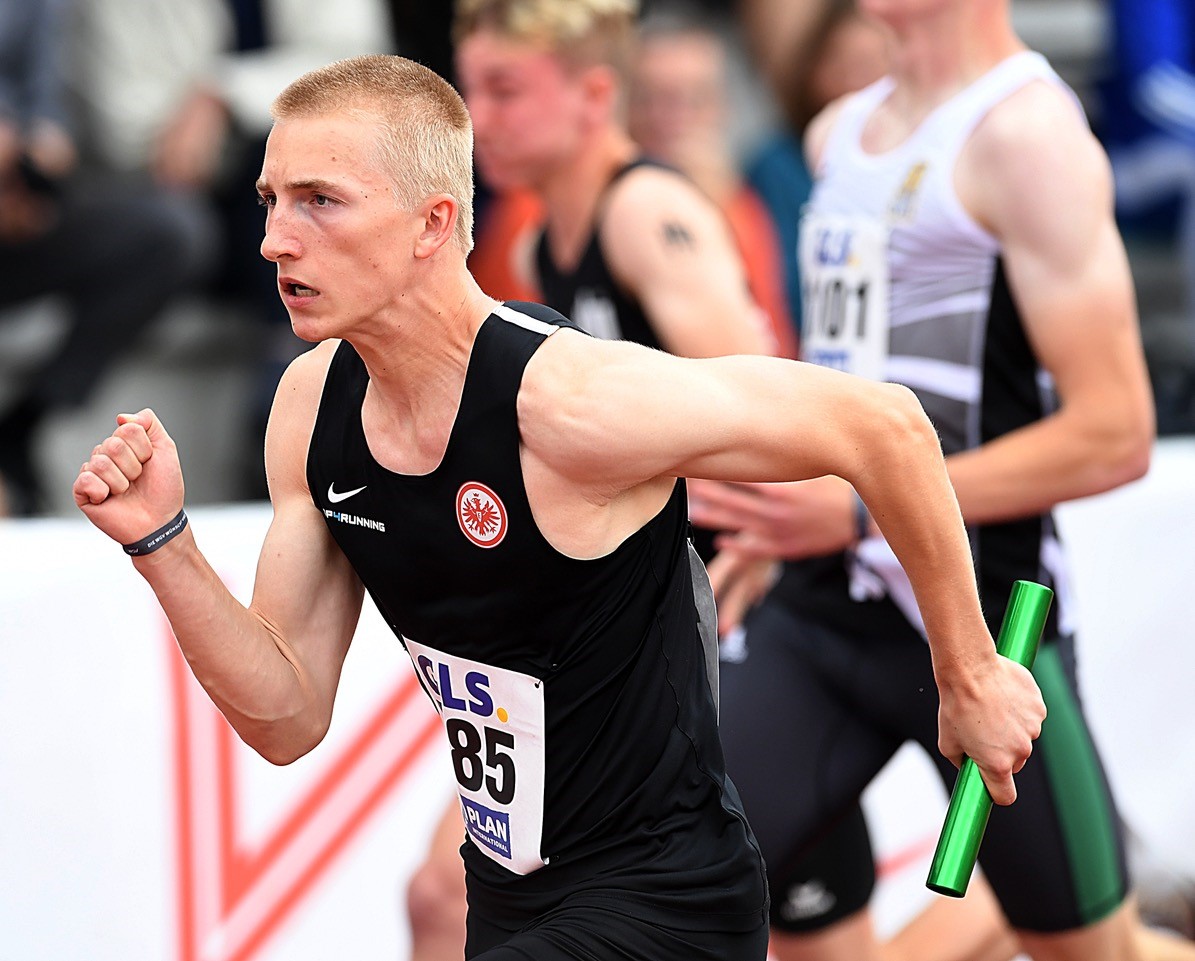 4x100 Meter: Die Jungs von Eintracht Frankfurt hatten sicherlich eine DM-Medaille im Visier, standen sie doch mit einer Vorleistung von 42,71 Sekunden als zweitbestes Team in der Meldestatistik. Und so kam es dann auch. Das Quartett in der Besetzung Justin Huang, Nicolas Ziegler, Laurin Hanke und Tom-Leander Duchardt flitzte in 42,75 Sekunden ums Tartanoval, was mit „Bronze“ belohnt wurde. Die siegreiche Mannschaft von Bayer Leverkusen lief mit 41,46 Sekunden in einer anderen Liga. Die Vizemeisterschaft ging in 42,17 Sekunden an die Startgemeinschaft „Sachsen-Anhalt“. Auf dem neunten Platz fand sich nach 44,09 Sekunden die Startgemeinschaft „Darmstadt-Gelnhausen-Wehrheim“ (Seidler, Stroh, E. Schneider, P. Schneider) wieder.