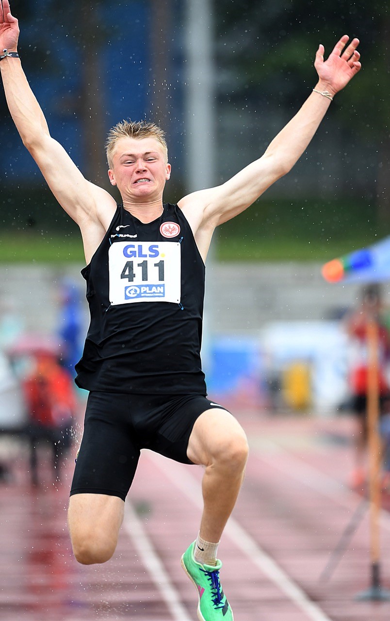Weitsprung: Ernest Schulze (TSV Bayer 04 Leverkusen) war der einzige Weitenjäger, der einen Sprung mit der „Sieben“ vor dem Komma anbieten konnte. Mit der neuen Bestmarke von starken 7,11 Metern war dem Athleten aus der Farbenstadt der Titel dann auch nicht zu nehmen. Gian Luca Trotzky (HSG Uni Greifswald) hatte mit seinem ersten Versuch 6,70 Meter markiert und lag damit bis zum letzten Durchgang auf dem zweiten Platz. Dann ging Nicolas Ziegler auf die Bahn. Für den Eintrachtler standen bis dahin 6,59 Meter und der fünfte Platz im Ergebnisprotokoll. Das änderte sich aber schlagartig, als 6,74 Meter auf der Anzeigetafel aufleuchteten. Damit konnte der Adlerträger den Konkurrenten aus Mecklenburg-Vorpommern noch abfangen und DM-Silber bejubeln. Raphael Botta (TSV Amicitia Viernheim) hatte seinen besten Besuch bei 6,45 Metern und wurde Sechster.