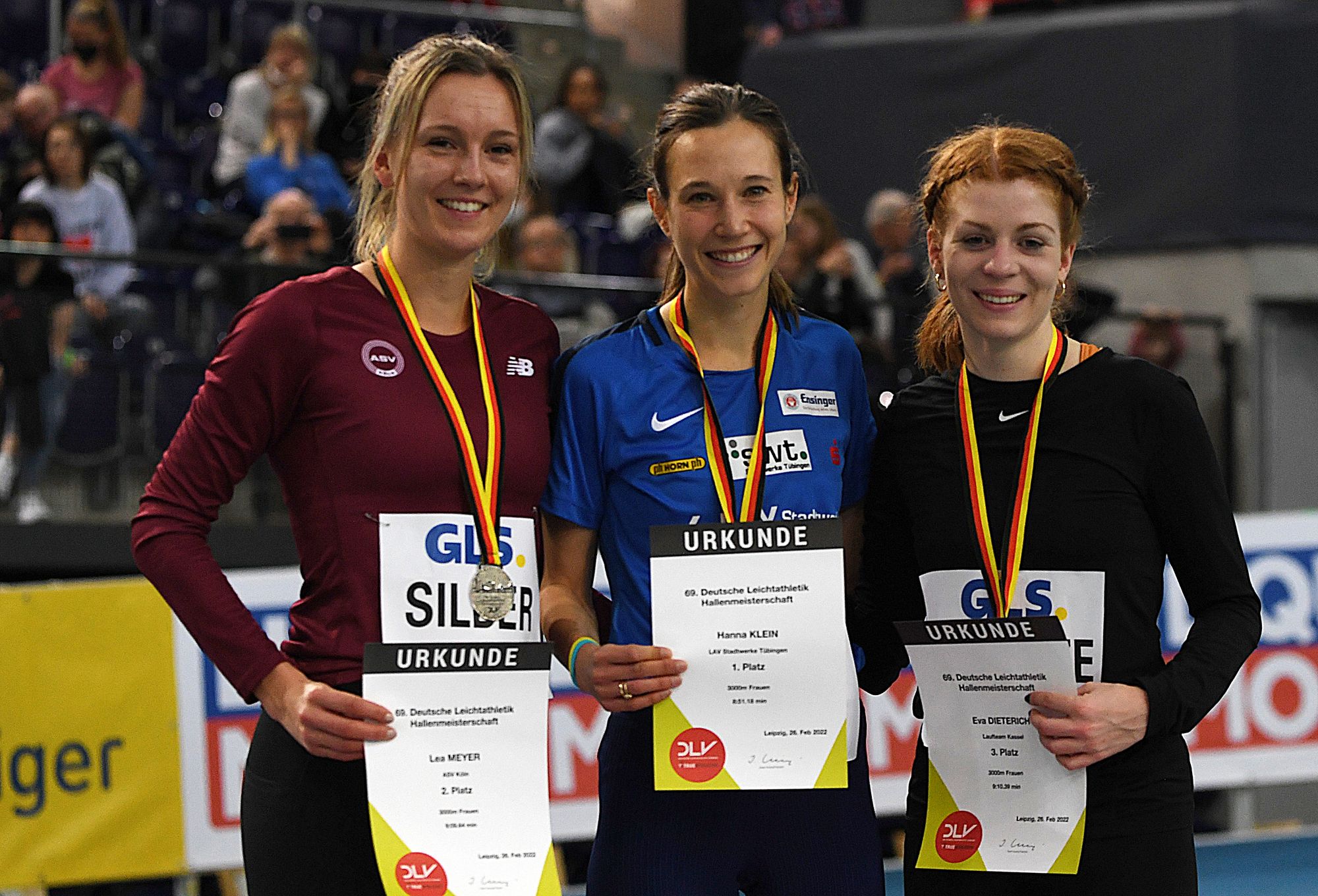 Zu einer beeindruckenden Solo-Vorstellung wurden die 3000 Meter der Frauen. Hanna Klein (LAV Stadtwerke Tübingen) trat nach einem guten Kilometer beherzt an und sprengte damit das Feld problemlos. Den Rest des Rennens spulte die Olympiateilnehmern von der Spitze weg im Alleingang ab und holte sich in 8:51,18 Minuten mit riesigem Vorsprung ihren bereits dritten DM-Titel. Die Gruppe der Verfolgerinnen wurde von Lea Meyer (ASV Köln) angeführt, die mit 9:06,64 Minuten die Vizemeisterschaft eintütete. Im Scheitelpunkt der letzten Kurve sah es noch so aus, dass Bronze an Sara Benfares (LC Rehlingen) gehen würde. Doch Eva Dieterich hatte in der Endphase des Rennens ihr Tempo konstant hoch gehalten, eisern gekämpft und sich Meter um Meter an das Top-Trio ran gearbeitet. Der Einsatz wurde belohnt, denn auf dem allerletzten Meter schob sich die Dieterich mit der neuen „PB“ von 9:10,39 Minuten und 0,02 Sekunden Vorsprung noch an der Saarländerin vorbei.