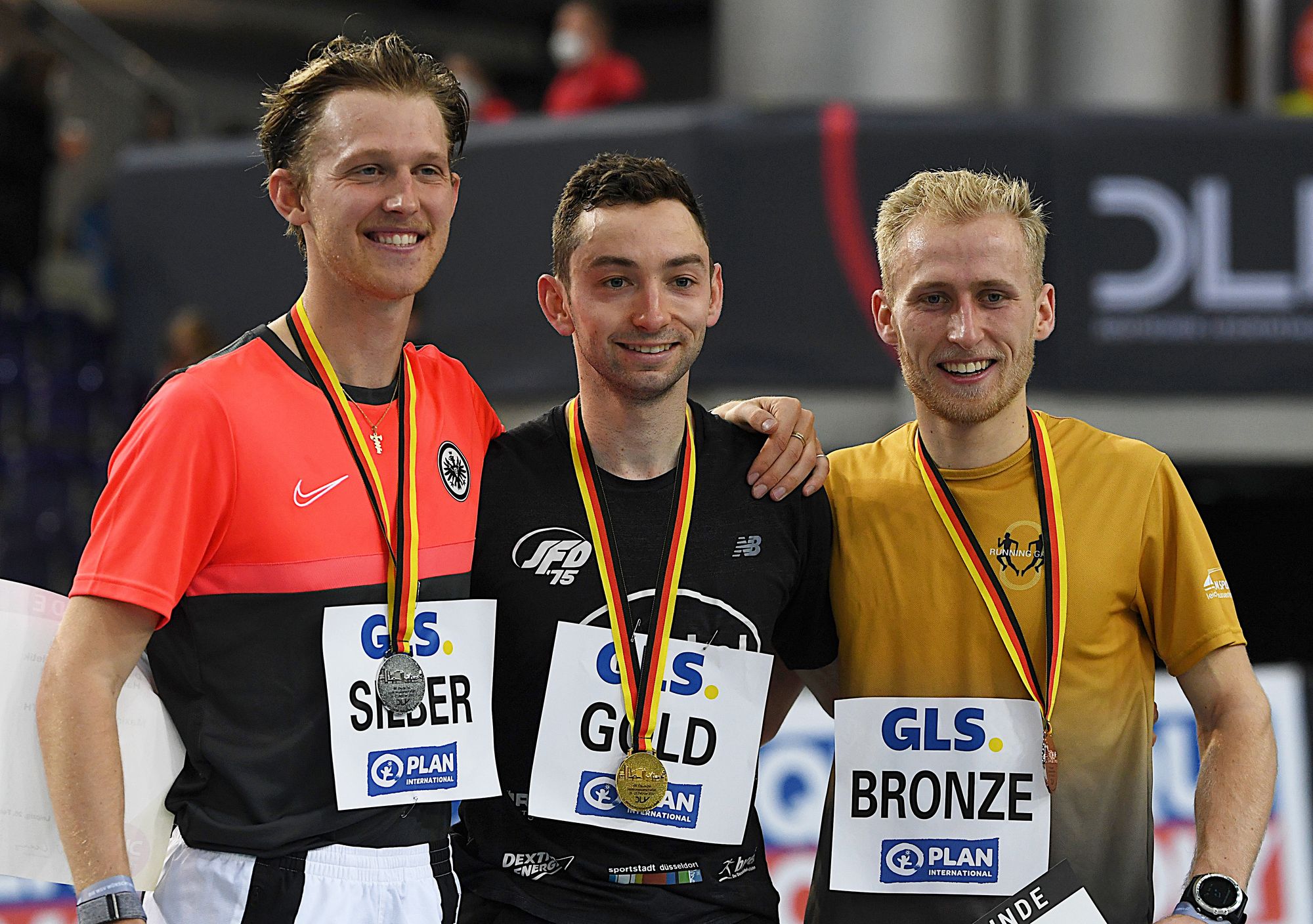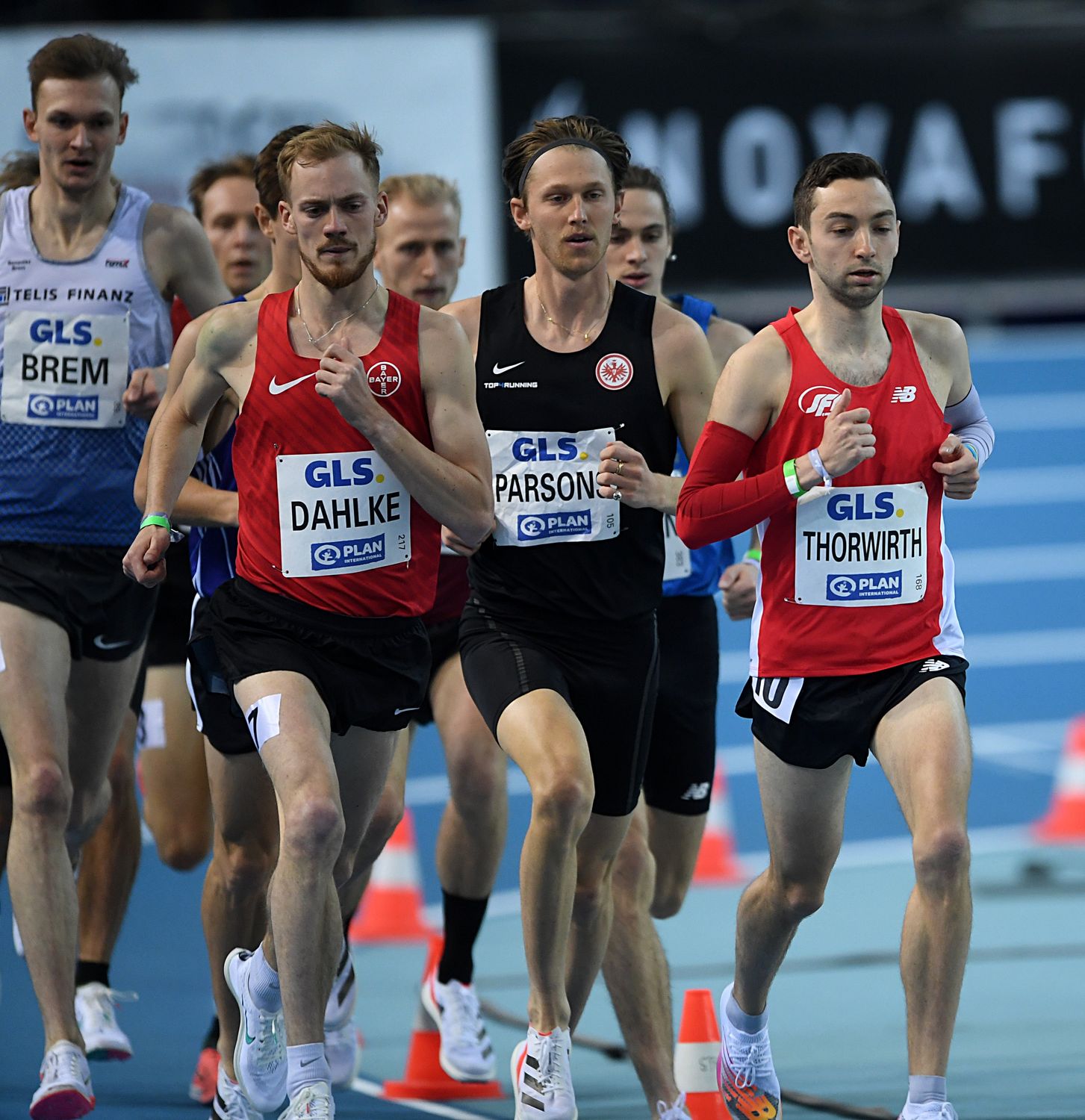 Die ganz schnellen Zeiten über 3000 Meter sind bei einer DM eigentlich nicht zu erwarten. So kam es dann auch. Kilian Schreiner (ASC 1990 Breidenbach) lag vorne, als das Feld bei knapp 2:47 Minuten die 1000 Meter passierte. Schreiner rutschte dann zwar etwas weiter nach hinten, kämpfte jedoch wacker und wurde am Ende als Sechster (8:11,41 min.) mit einer neuen Bestzeit belohnt. Bei der 2000er Marke war das Tempo mit 5:31 Minuten nicht sonderlich flotter geworden. Es war Favorit Maximilian Thorwirth (SFD 75 Düsseldorf Süd), der kurz zuvor die Führungsarbeit übernommen hatte. Runde um Runde spulte der Düsseldorfer an der Spitze ab. In seinem Schlepptau Sam Parsons, der keine Anstalten machte, auch einmal etwas fürs Tempo zu tun. Als der Eintrachtler dann attackierte, hielt Thorwirth dagegen und wurde seine rundenlange Führungsarbeit nach 8:01,43 Minuten verdient mit dem DM-Titel belohnt. Parsons, 2019 deutscher Meister über 3000 Meter, wurde mit 8:02,13 Minuten Zweiter.