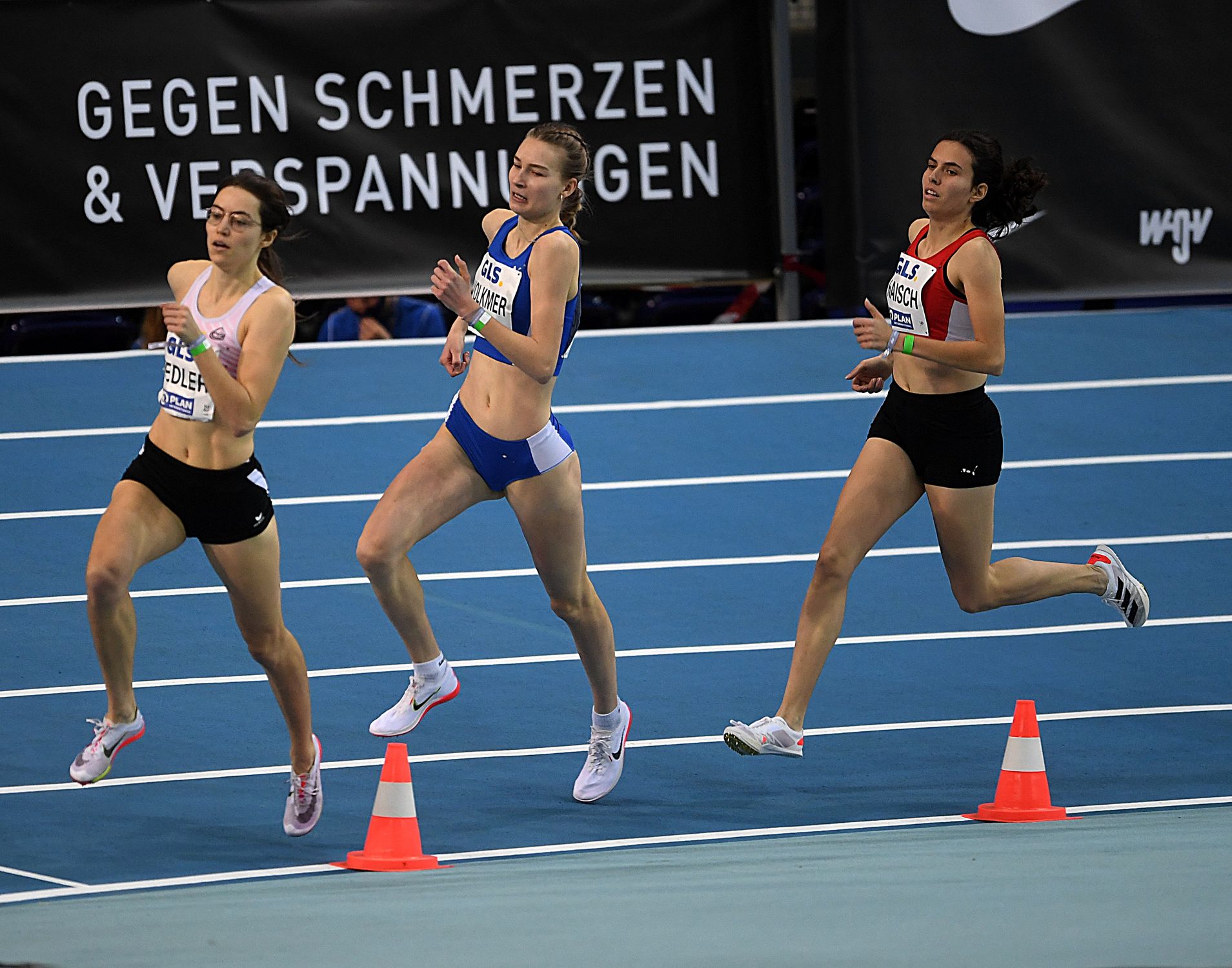 Bei den Frauen liefen sich die beiden Vertreterinnen des HLV ebenfalls ins Finale. Julia Swelam (TSV Kirchhain) machte es als Zweite ihres Rennens mit 2:10,26 Minuten „direkt“. Sophia Volkmer (TV Wetzlar) zog in ihrem Lauf als Dritte mit der neuen Hallenbestzeit von 2:08,51 Minuten nach und musste damit ebenfalls nicht die Zeitregel bemühen.