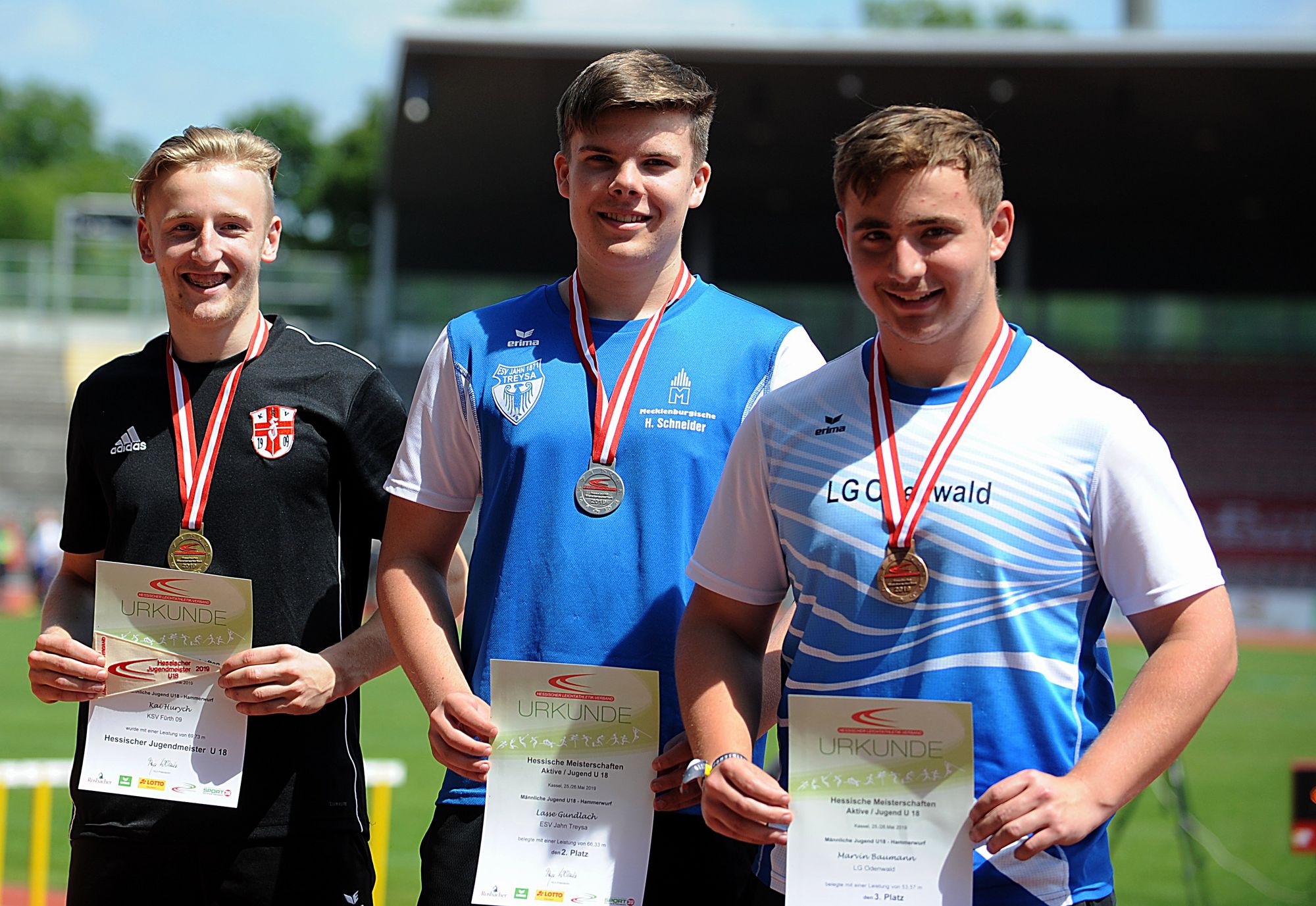 Kai Hurych (KSV Fürth) war bei den Hammerwerfern der Herr im Ring. Im zweiten Durchgang schleuderte er das fünf Kilogramm schwere Sportgerät auf 69,73 Meter und hakte sicher den Richtwert von glatten 69 Metern ab. Stark präsentierte sich auch Lasse Gundlach (ESV Jahn Treysa) als Zweiter mit der persönlichen Bestleistung von 66,33 Metern. Marius Karges (LG Eintracht Frankfurt) ließ den Diskus auf 55,83 Meter segeln, womit ihm nur 17 Zentimeter zum EYOF-Ticket fehlten. Zudem trug sich der Eintrachtler im Kugelstoßen (16,11 Meter) in die Siegerliste ein.