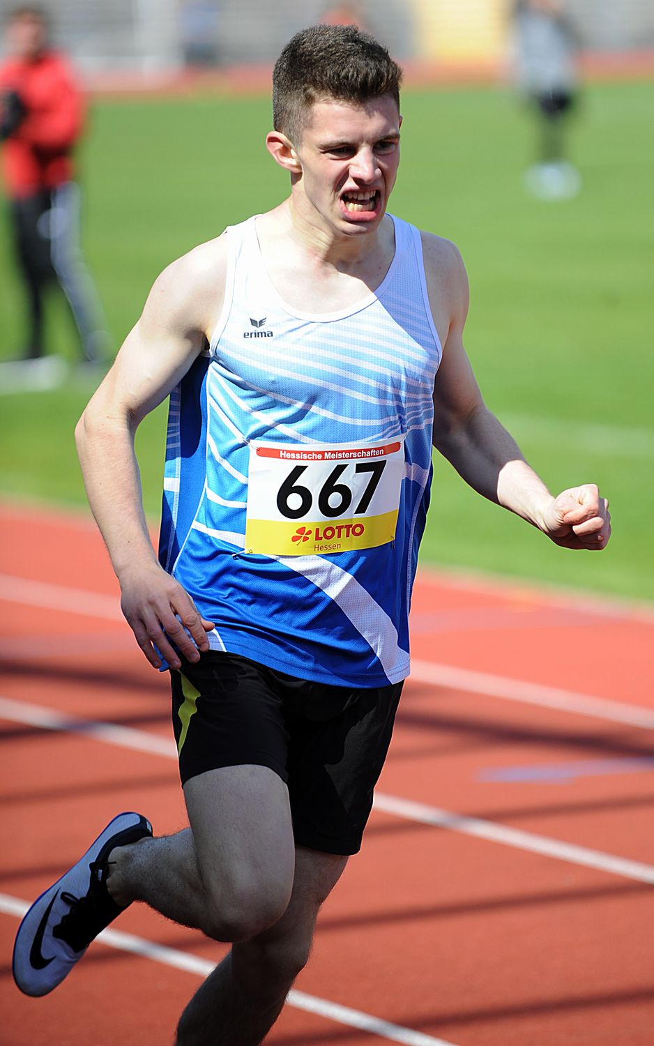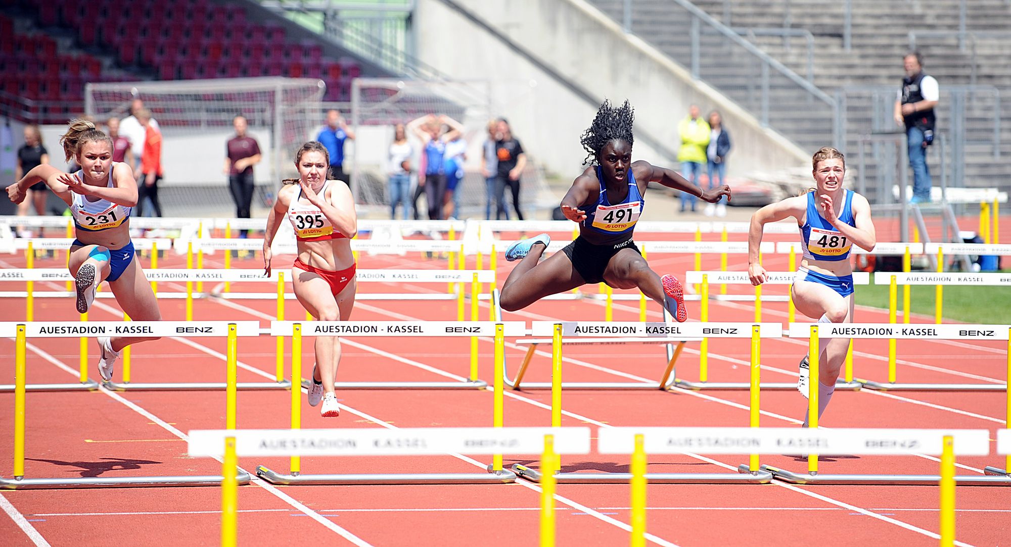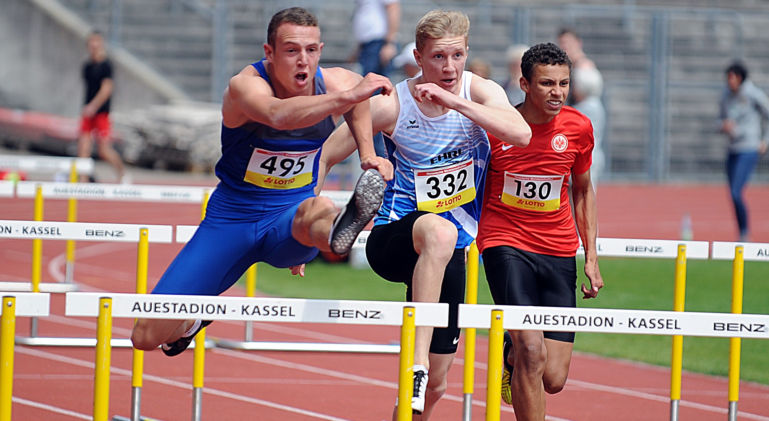 Reichlich Leistungen auf sehr hohem Niveau gab es bei den hessischen Meisterschaften der Altersklasse U18, die parallel zu den Aktiven im Kasseler Auestadion stattfanden. Zudem hatten einige Nachwuchs-Asse die Norm für das European Youth Olympic Festival (EYOF) Ende Juli in Baku (Aserbaidschan) im Blick. Ein Höhepunkt der zweitägigen Titelkämpfe war das Rennen über 110 Meter Hürden. Schon im Vorlauf zeigte Moritz Mainka (Wiesbadener LV), dass er in toller Form ist. Mit herausragenden 13,80 Sekunden stürmte der Kaderathlet zum Sieg, verbesserte den knapp fünf Jahre alten Hessenrekord von Christopher Nagorr (LAZ Gießen/13,98) deutlich und knackte ganz sicher die EYOF-Norm (13,95). Im Finale gelang dem Youngster noch eine minimale Steigerung auf 13,79 Sekunden, obwohl ihm ein strammer Gegenwind (- 2,2 m/sec.) entgegenblies.
