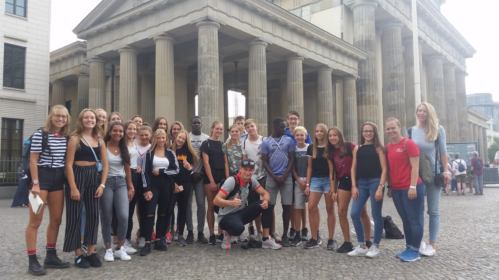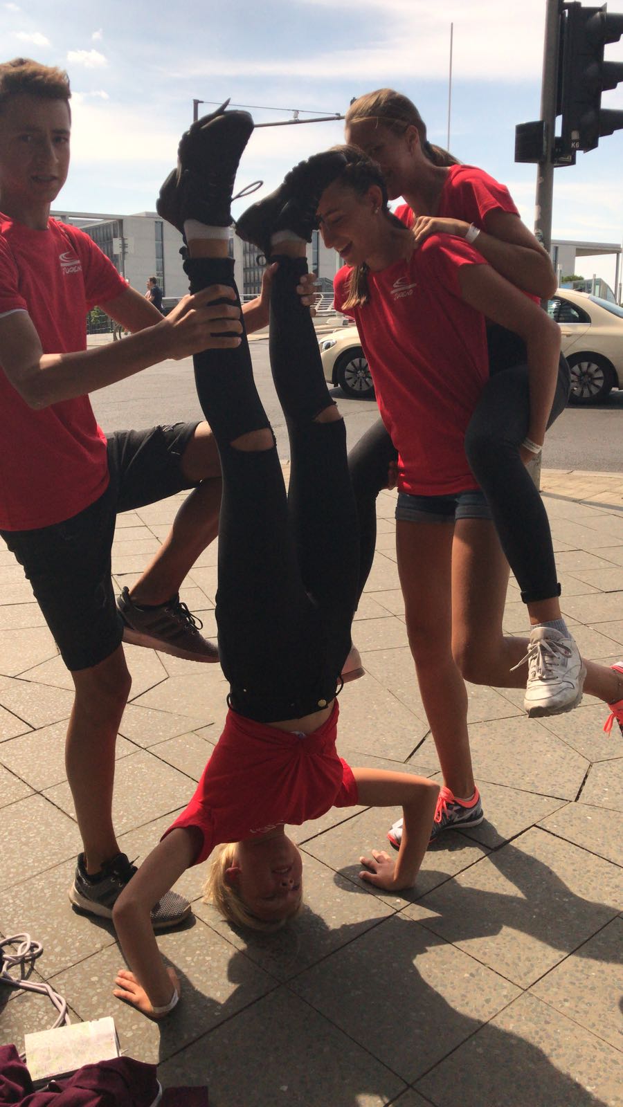 Und los ging es bei strahlendem Wetter zur Berliner Sightseeingtour. Für die Meisten war es der erste Hauptstadtbesuch und darum eine geeignete Möglichkeit Berlin kennenzulernen. Die einzelnen Stationen wurden durch die TeilnehmerInnen selbst vorbereitet und hervorragend den anderen näher gebracht. So bewegte sich die Gruppe sportlich lernend und mit vielen neuen Eindrücken durch Berlin und traf sogar den kürzlich gekrönten Speerwurf-Europameister Thomas Röhler. Am Nachmittag gab es Zeit für freie Verfügung und die TeilnehmerInnen konnten in Kleingruppen losziehen. Die meisten vergnügten sich auf der Fanmeile am Breithscheidtplatz und konnten sich so schon einen ersten Eindruck von der tollen EM-Stimmung in Berlin verschaffen. Pünktlich um 15 Uhr versammelte sich die Gruppe an der Gedächtniskirche, lauschte einem weiteren Beitrag und machte sich anschließend auf den Rückweg zur Jugendherberge. Dort angekommen blieb noch ein wenig Zeit um sich auf dem Zimmer kurz vom Tag zu erholen und sich für abendlichen Stadionbesuch frisch zu machen.