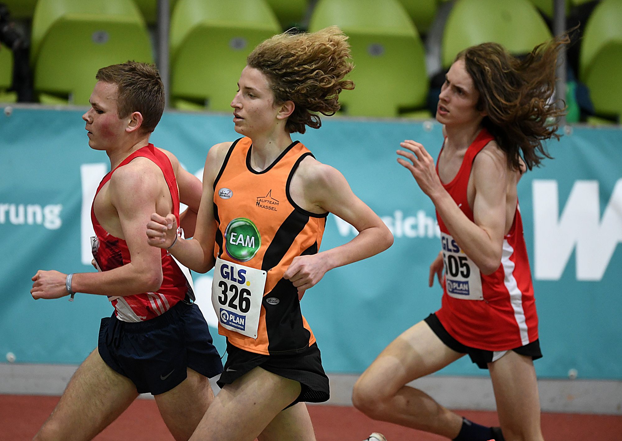 Über 3000 Meter drehte Moritz Kleesiek (Laufteam Kassel) seine Runden. Nach moderatem Beginn (3:05 bzw. 6.06 Minuten auf dem ersten und zweiten Kilometer) wurde es auf den letzten fünf Runden dann immer schneller. Klar, dass ich dann das Feld schnell weit auseinander zog. Am Ende entwickelte sich ein Zweikampf, den Felix Ebel (Emder Laufgemeinschaft) nach 8:44,95 Minuten mit winzigen 0,04 Sekunden Vorsprung gegenüber Robin Müller (LC Top Team Thüringen) zu seinen Gunsten entscheiden konnte. Moritz Kleesiek war mit 8:52,14 Minuten der schnellste Verfolger und konnte Bronze bejubeln.