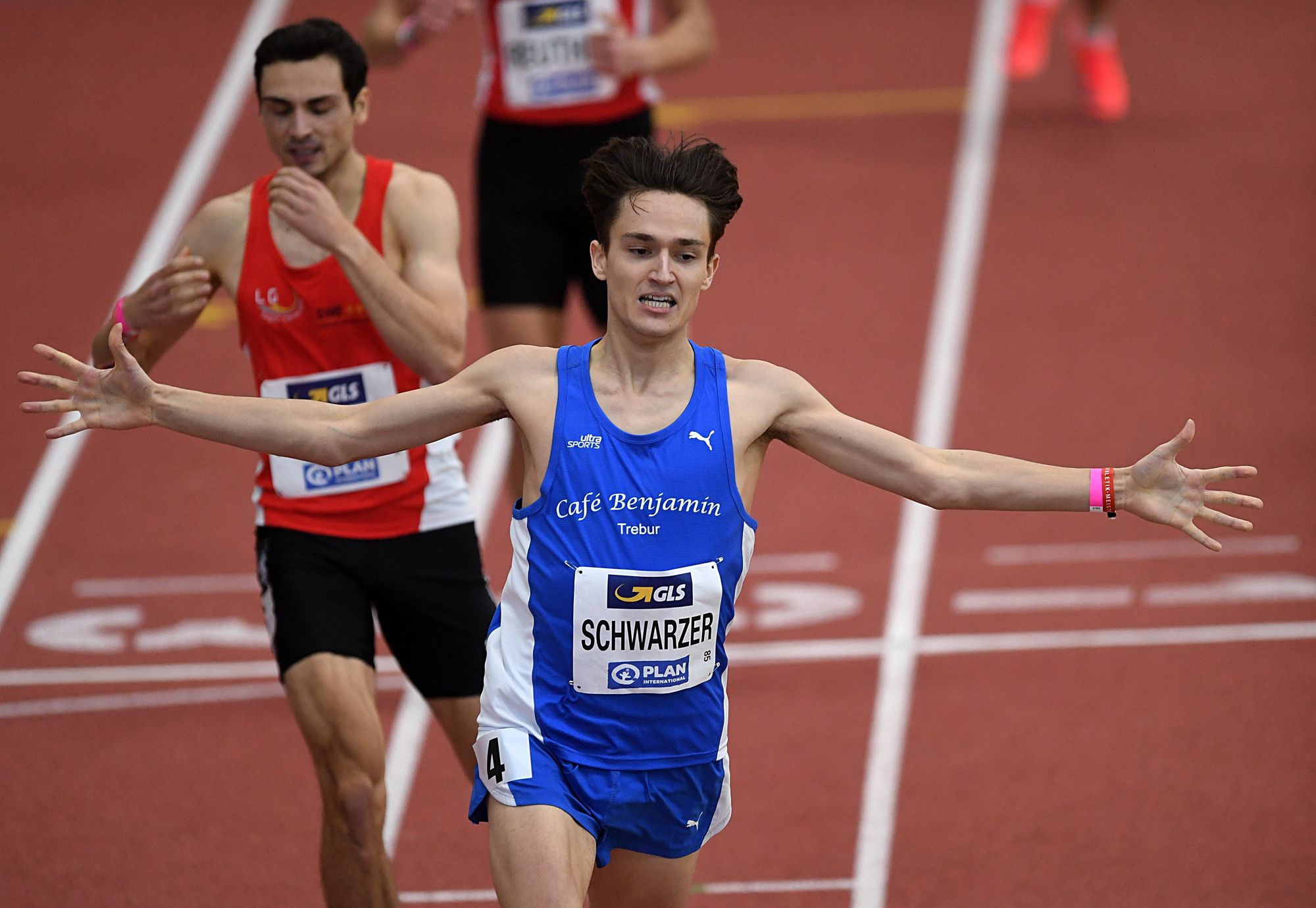 Glasklarer Favorit war Marc Reuther (Eintracht Frankfurt), der in einem „gestrickten“ Rennen mit Tempomacher in dieser Saison bereits starke 1:46,21 Minuten vorgelegt hatte. Diesmal musste Reuther selbst für die Pace sorgen und ging gleich an die Spitze. Nach einer schnellen Anfangsrunde wurden die 400 Meter in 52,26 Sekunden passiert und auch nach 600 Metern lag der Eintrachtler noch vorne. Dann schlossen die Verfolger immer mehr auf. Auf der Zielgeraden zog erst Christoph Kessler (LG Region Karlsruhe) vorbei und sah eigentlich wie der sichere Sieger aus. Schwarzer agierte während des Rennes überaus klug und war immer auf der Höhe des Geschehens. Auf den letzten Metern schaltete der U23er dann den Turbo ein, überlief noch Kessler und holte sich in der neuen Bestzeit von 1:47,63 Minuten sensationell den DM-Titel. Selbst im Freien war der angehende Polizist noch nie so schnell unterwegs gewesen. Als Zweiter unterbot Christoph Kessler (1:47,83 min.) erneut die EM-Norm für Torun. Marc Reuther musste nach 1:48,70 Minuten mit einem für ihn enttäuschenden dritten Platz zufrieden sein. Anfang März werden die Karten für dieses Trio, die Nominierung am Montag sollte so gut wie sicher sein, bei der Hallen-EM gegen sehr starke internationale Konkurrenz dann neu gemischt.