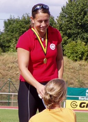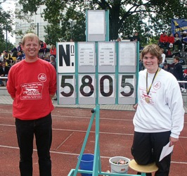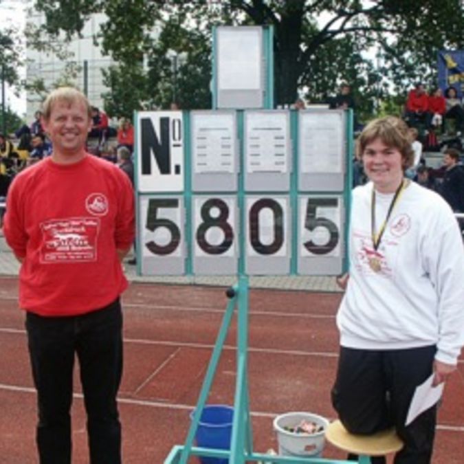 Bei den diesjährigen Süddeutschen Meisterschaften der Schüler/innen und Junioren/innen am 21./22.08.04 in Arnstadt gab es insgesamt 14 Goldmedaille für den Hessischen Leichtathletikverband zu vermelden. Bei den Schülern M15 sicherte sich Moritz Nick vom TV Gelnhausen in 11,44 sec. die Bronzemedaille über 100 m. Die Jungs des TV Groß-Gerau brachten das Staffelholz über 4x100 m nach 45,69 sec. ins Ziel und durften sich damit über den Gewinn der Silbermedaille freuen. Im Stabhochsprung gab es einen Doppelerfolg für den HLV. Jan Mönnich von der SSC Bad Sooden-Allendorf stieg erst bei 3,50 m ein und benötigte dann nur zwei Versuche, um mit 3,70 m vor seinem Verbandskollegen Lars Rudolph Schüller vom TV Michelbach mit 3,60 m zu gewinnen. Die Kugel von Marian Sparig vom TV Gelnhausen flog im 4. Versuch auf 15,19 m, was am Ende Platz drei bedeutete. Im Speerwurf setzte er all seine Kraft in den ersten Versuch und konnte seinem Speer lange hinterher schauen. Erst nach 66,00 m stieß er in den Rasen und bescherte Marian den Süddeutschen Schülertitel mit über 11m Vorsprung auf den Zweitplatzierten. Bei den Schülerinnen W15 konnte nur eine einzige Athletin aus Hessen in die Medaillenränge laufen. Über 300 m Hürden überquerte Sydney Sammet mit 45,60 sec. am Schnellsten die Hürden und belegte somit Rang eins. Über 300 m flach hatte die Athletin vom TV Groß Gerau bereits die Bronzemedaille mit 41,23 sec. gewonnen. Foto rechts: Sabine Rumpf mit ihrem Trainer Martin Picogna