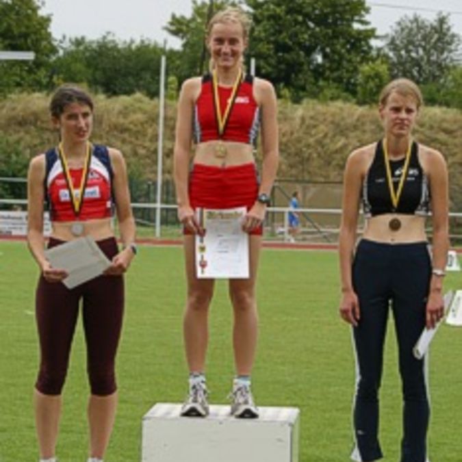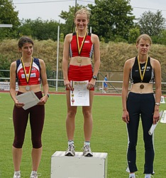 Bei den Junioren konnte sich der B-Jugendliche Nils Müller vom Friedberg-Fauerbach mit 21,95 sec. über 200 m die Silbermedaille sichern. Im 400 m Endlauf lief Philllip Baier von der LG Eintracht Frankfurt ein beherztes Rennen und wurde mit 48,77 sec. und Rang zwei belohnt. Sören Ungermann vom TV Gelnhausen musste sich zweimal an diesem Wochenende geschlagen geben. Über 800 m benötigte der Deutsche Jugendmeister des vergangenes Jahres über 3000 m 1:52,57 min. und über 1500 m kam er auf 4:02,09 min.. Ebenfalls ein Athlet aus den Reihen des TV Gelnhausen sicherte sich zwei Medaillen. 13,85 m weit flog die Kugel von Stefan Zülch, womit er sich den Vizemeistertitel sicherte. Im Diskuswurf belegte Stefan mit 38,75 m den dritten Platz. Im Hammerwurf wurde Jens Rautenkranz von der LG Eintracht Frankfurt seiner Favoritenrolle gerecht und siegte mit 68,24 m. Die Juniorinnen sammelten die meisten Medaillen in Türringen für das Land Hessen. Im 200 m Endlauf sicherte sich die A-Jugendliche Sandra Oehme vom TV Burgsolms mit 24,91 sec. die Silbermedaille. Über die doppelt solange Distanz (400m) konnte sich die Deutsche Hochschulhallenmeisterin über 800 m Sabine Bachmann von der LG Eintracht Frankfurt über Rang drei freuen. Leichtes Spiel über 800 m hatte Nadine Ripl von der LC Mengerskirchen im Lauf über 800 m. Mit 2:18,47 min. konnte die junge Läuferin einen Start-Ziel-Sieg verbuchen. Foto links: Nadine Ripl (Mitte) bei der Siegerehrung