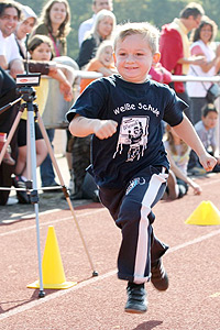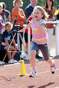 Gießen (khn). »Lauf, lauf« und »komm, komm, komm«, schallt es durch das Weststadion. Am Rand der Kunststoffbahn stehen Eltern und treiben ihre Kinder mit Rufen und Klatschen bis ins Ziel an. Es war ein besonderer Wettkampf am Wochenende am Gleiberger Weg. Gesucht wurden die »schnellsten Grundschüler Gießens«. Der in Hessen einmalige Wettbewerb fand im Rahmen des Schüler-Herbstmeetings des Leichtathletik-Zentrums (LAZ) von Stadt und Land sowie des Hessischen Leichtathletik-Verbands, Kreis 12 Gießen, statt. Gemessen wurde zunächst die Zeit mit Hilfe von vier Lichtschranken, die entlang einer 30 Meter langen Strecke aufgestellt worden waren: Bei diesem »fliegenden« Sprint sind die Kinder schon vor Beginn des ersten Messpunkts losgerannt. Für den Finallauf über 50 Meter samt Startblock, »Achtung - fertig - los« und manchmal der entsprechenden Nervosität konnten sich dann die jeweils sechs Besten der teilnehmenden Jahrgänge qualifizieren. Mitmachen konnten alle Jungen und Mädchen, die zwischen 1998 bis 2002 geboren worden sind. Das LAZ und der Leichtathletik-Sportkreis hatten nach den Sommerferien an den Gießener Grundschulen - 15 der 17 nahmen das Angebot an - Wettläufe über 30 Meter veranstaltet. Insgesamt 1766 Kinder wurden auf diese Weise gesichtet. Die Jahrgangs-Besten jeder Schule, insgesamt rund 100 hoffnungsvolle Sprinterinnen und Sprinter, wurden nun zum Endkampf auf den Sportplatz der Herderschule eingeladen; für die 50-Meter-Endläufe qualifizierten sich rund 50. Voraussetzung für die Teilnahme war, dass die Kinder noch nicht Mitglied in einem Leichtathletikverein sind. Ziel des Wettkampfes ist es, Begabte zu entdecken und zu versuchen, diese für einen Leichtathletikverein zu begeistern. »Wenn wir hier drei Talente finden, dann war es den ganzen Aufwand wert«, sagte Kurt Drolsbach, zweiter Vorsitzender des LAZ in Gießen. So solle dem Nachwuchsproblem im Leichtathletikbereich entgegengewirkt werden. »Gerade das Grundschulalter ist ideal, um Grundlagentraining zu betreiben«, so Drolsbach. In diesem Alter könne man die Basis für ein erfolgreiches Sportlerleben legen. »Leichtathletik ist nach wie vor die Sportart Nummer eins bei den Olympischen Spielen«, so Drolsbach. Ohne Arbeit vor Ort allerdings »gibt es keine Spitzenleistungen«. Ein weiteres Ziel der Veranstaltung war es, auch Eltern für ehrenamtliches Engagement zu gewinnen. »Uns fehlen freiwillige Kampfrichter bei den Wettkämpfen der jungen Leichtathleten«, so Drolsbach. Für ein wenig Ärger sorgte der Zustand des städtischen Sportplatzes vor Beginn der Wettkämpfe. Beispielsweise lagen zahlreiche Scherben in der Nähe der Hochsprunganlage. Auch die Sportanlage und die Umkleideräume waren nach Angaben Drolsbachs stark verdreckt. Als Veranstalter verlasse man die Anlagen stets sauber, sagte Eckhard Paul, Erster Vorsitzender des Leichtathletik-Sportkreises, doch: »Bei der Stadt ist wohl niemand in der Lage, dieses Problem anzugehen.« Schon zum zweiten Mal suchten die Organisatoren Gießens schnellste Grundschüler. Im letzten Jahr hieß die Veranstaltung noch »Gießen sucht den Supersprinter«. 2009 soll der Wettkampf schließlich auf die Schulen im Landkreis ausgeweitet werden. Unterstützt wurde die Veranstaltung vom Staatlichen Schulamt. Bemerkenswert: Das schnellste Mädchen, Lucy Ella Marie Weingarten von der Weißen Schule Wieseck (Jahrgang 2000), erreichte mit 8,29 Sekunden eine Zeit, die nur von einem einzigen Jungen geschlagen wurde, nämlich von Wolf Enzmann. Der Korczak-Schüler des Jahrgangs 1999 brauchte für die 50 Meter vom Startblock 8,25 Sekunden. Diese beiden ließen auch die ein oder zwei Jahre Älteren hinter sich. Über 30 Meter mit »fliegendem« Start hatte bei den Mädchen ebenfalls Lucy Weingarten mit 4,44 Sekunden die Nase vorn, der mit Abstand Schnellste war Victor Velmeden (Ludwig-Uhland-Schule, Jahrgang 1999) mit 4,16 Sekunden. Die übrigen Jahrgangs-Sieger waren bei den Jungen: Jahrgang 2002: Julius Franzen (Ludwig-Uhland-Schule), 2001: Dennis Owusu (Goetheschule Gießen), 2000: Paul Stengel (August-Herrmann-Francke-Schule) und 1998: Nando Meiswinkel (Ludwig-Uhland-Schule); bei den Mädchen: Jahrgang 2002: Alica Saenko (Ludwig-Uhland-Schule), Amelie Juliane Ruddies (Korczak-Schule), 1999: Lea Zimmermann (Lindbachschule Lützellinden) sowie 1998: Maren Leonie Arbeiter (Ludwig-Uhland-Schule). Gießener Allgemeine Zeitung, Artikel vom 01.10.2008 Fotos: Rainer Schmidt