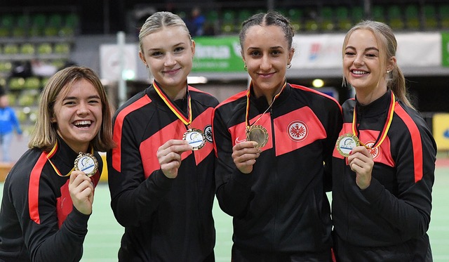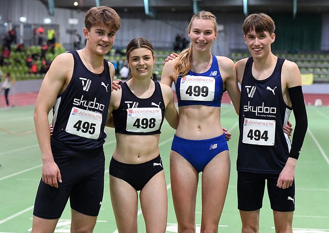 Bei den abschließenden Staffeln gab es dann noch reichlich Edelmetall. Über 4x200 Meter ging gleich der komplette Medaillensatz nach Hessen. An der Spitze setzte sich die erste Mannschaft der Eintracht (Philip Hennemuth, Daniel Borchardt, Herman Schulz, Florian Daum) in 1:28,54 Minuten durch. Es war aber eine knappe Angelegenheit, denn die Adlerträger hatten lediglich dünne 0,25 Sekunden Vorsprung auf die Truppe der Startgemeinschaft „Königstein/Groß-Gerau“. Aaron Amenta, Finn Kohlenbach, Maurice Andrew und Julian Rubel flogen in 1:28,79 Minuten und die Bahn und werden beim Nachwuchs in Deutschland aktuell auf den dritten Platz geführt. Das Podium komplettierte Eintracht II (Isenbart, Peters, Stahl, Gutmann/1:29,88 min.). Über 4x400 Meter hatte die Eintracht-Truppe (Tim Peters, Niclas Kruff, Jakob Busch, Maximilian Arzt-Jones) mit 3:26,06 Minuten die Vertretung der Startgemeinschaft „Gormaringen-Hall-Pliezhausen“ (3:26,77 min.). Die 4x400 Meter in der „Mixed-Variante“ waren mit 3:31,66 Minuten eine sichere Beute der Lokalmatadoren des VfL Sindelfingen. Auch dem Silberrang lief der TV Wetzlar (Tom Stöber, Sophia Volkmer, Antonia Unger, Kjell Wörner/3:25,40 min.), die LG Bad Soden-Sulzbach-Neuenhain (Kai Strauch, Silke Dittombee, Anne Burkardtova, Johannes Nortmeyer/3:40,80 min.) belegte den dritten Platz.