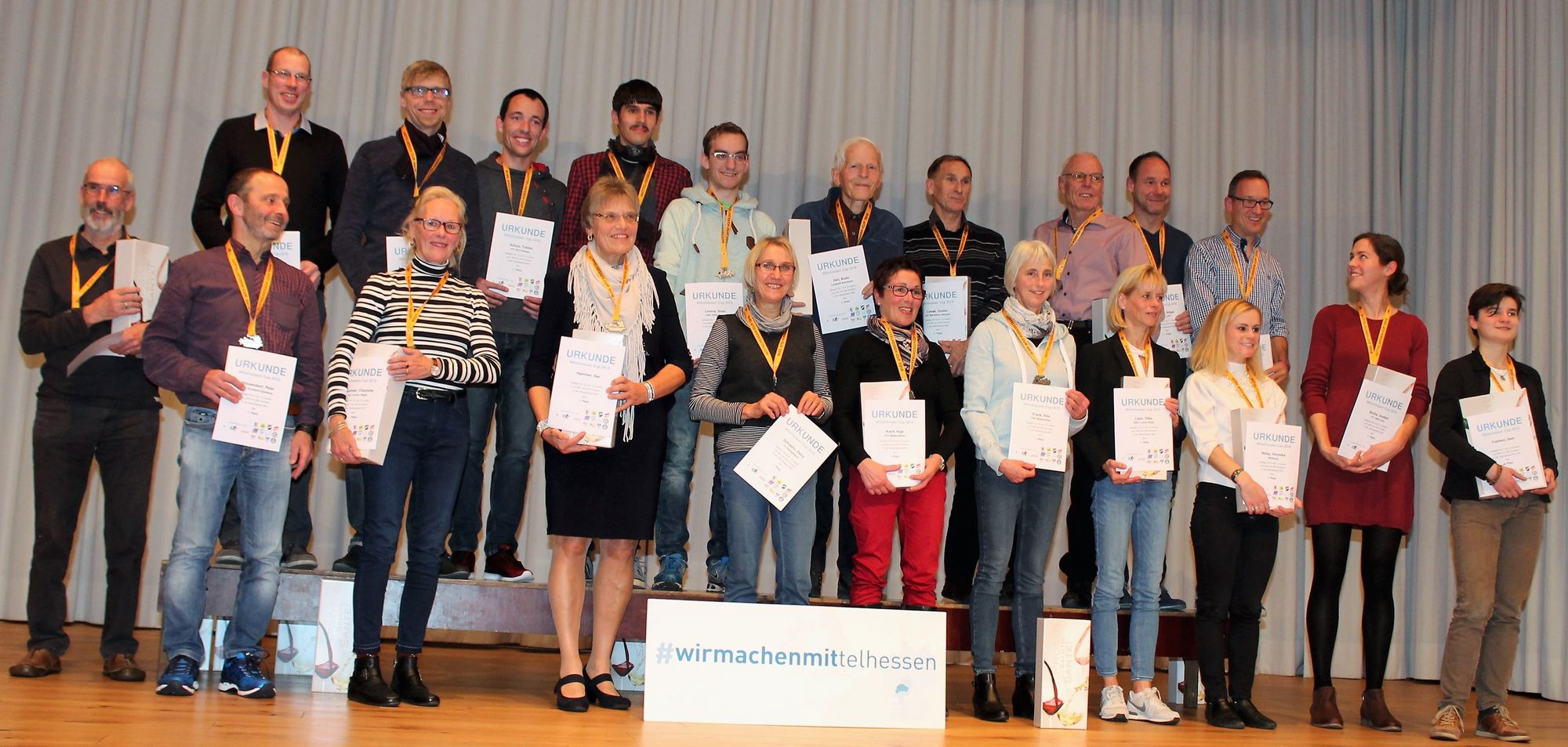 Die Veranstalter des Mittelhessen-Cups 2018 hatten zur Abschlussfeier und Siegerehrung in die Halle des TSF Heuchelheim eingeladen. In dem vollbesetztem Haus führten Markus Bourcarde (Team Naunheim) und Sven Schnitker (LGV Marathon Gießen) durch das Programm. Ultra-Langstrecklenläufer Joe Kelbel berichtete von seinen Starts beim Shanghai-Marathon und dem Zagora-Sahara-Trail über 52 Kilometer.