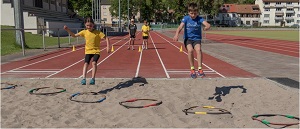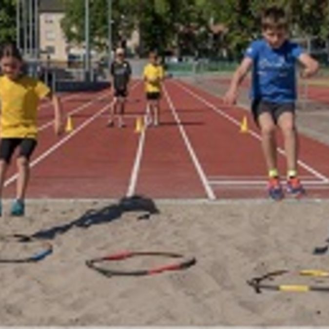 In der Weitsprunggrube werden in (je nach verfügbarem Platz) 4 - 6 Reifen in verschiedene Bahnen mit verschiedenen Entfer-nungen platziert. Die Kinder versuchen zunächst, aus etwa 10 Metern Anlauf in den Reifen mit der geringsten Entfernung zu springen. Gelingt dies, gehen sie sich im nächsten Durchgang eine Bahn weiter und versuchen sich an der nächsten Sprung-weite. Gelingt es dem Kind nicht, in den Reifen zu springen, hat es noch einen zweiten Versuch. <ENDE/> Gelingt auch der zweite Versuch nicht, muss es wieder in die Bahn mit einer Schwierigkeitsstufe niedriger zurück wechseln. Die vollständige Trainingskarte und weitere Details zur Übung findet Ihr hier.