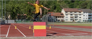 Direkt vor der Weitsprunggrube wird ein Hochsprung-Set aufgebaut (z.B. mit Zauberschnur oder Hochsprunglatte). Die Kinder laufen frontal aus etwa 10 Metern Anlauf an und springen einbeinig ab (optional von einer Absprunghilfe, wie z.B. Sprungbrett, Kastenoberteil). Die Landung erfolgt beidbeinig in der Weitsprunggrube. Alternativ kann auch auf eine Hochsprungmattte über eine Zauberschnur gesprungen werden. Die vollständige Trainingskarte und weitere Details zur Übung findet Ihr hier.