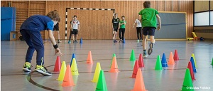Die Kinder werden in mehrere Staffelteams aufgeteilt und positionieren sich hinter einer Startlinie. In etwa 15 Metern Entfernung werden zahlreiche verschiedenfarbige Hütchen zufällig angeordnet unter denen Lego-Steine paltziert sind.Die Kinder rennen zu den Hütchen nehmen sich einen Lego-Stein und kehren zum Team zurück. Jeder nachfolgende Läufer darf solange Hütchen anheben, bis er einen Lego-Stein gefunden hat. Das Spiel endet, wenn keine Lego-Steine mehr einzusammeln sind. Welches Team kann aus den eigenen Steinen den höchsten Turm bauen? Die vollständige Trainingskarte und weitere Details zur Übung findet Ihr hier.