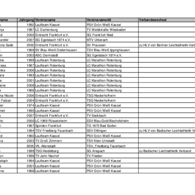 Hier finden Sie die Wechselliste 2018/19 (aktualisiert am 03.01.2019) mit den Zu- und Abgängen im Hessischen Leichtathletik-Verband sowie den Wechseln innerhalb Hessens.