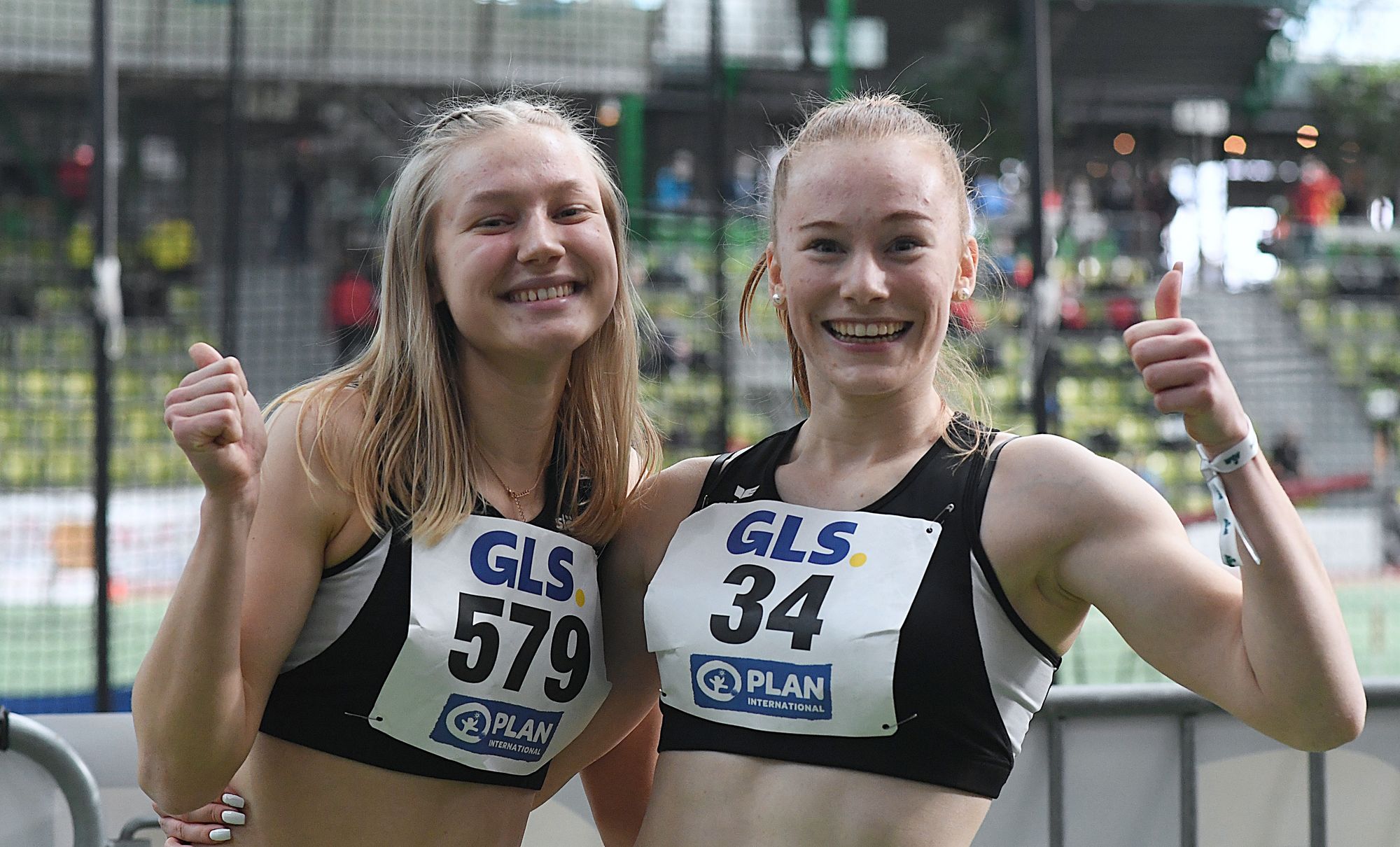 Dass gleich zwei Hessinnen in ein Finale über 60 Meter stürmen, sieht man auch nicht bei jeder Meisterschaft. In Sindelfingen gab es als Sahnehäubchen noch Medaille dazu. Doch der Reihe nach. Mira Baus (SG Schlüchtern) hatte als Zweite nach 7,68 Sekunden den Vorlauf abgehakt und das große „Q“ hinter ihrem Namen. Im Halbfinale zeigte Mira 7,65 Sekunden, wiederholte diese Zeit wenig im Endlauf und wurde Sechste. Carolin Schlung (SSC Bad Sooden-Allendorf) machte als Zweite ihres Vorlaufes mit 7,62 Sekunden die nächste Runde klar. Hier war die Nordhessin mit 7,61 Sekunden dann einen Tick schneller unterwegs, um dann in Finale richtig durchzustarten. Hier leuchteten dann hervorragende 7,51 Sekunden auf der Anzeigetafel auf, die mit der deutschen Vizemeisterschaft belohnt wurden. Siegerin Sina Kammerschmitt (TG Worms) sprintete mit 7,42 Sekunden in die europäische Spitzenklasse der U20.