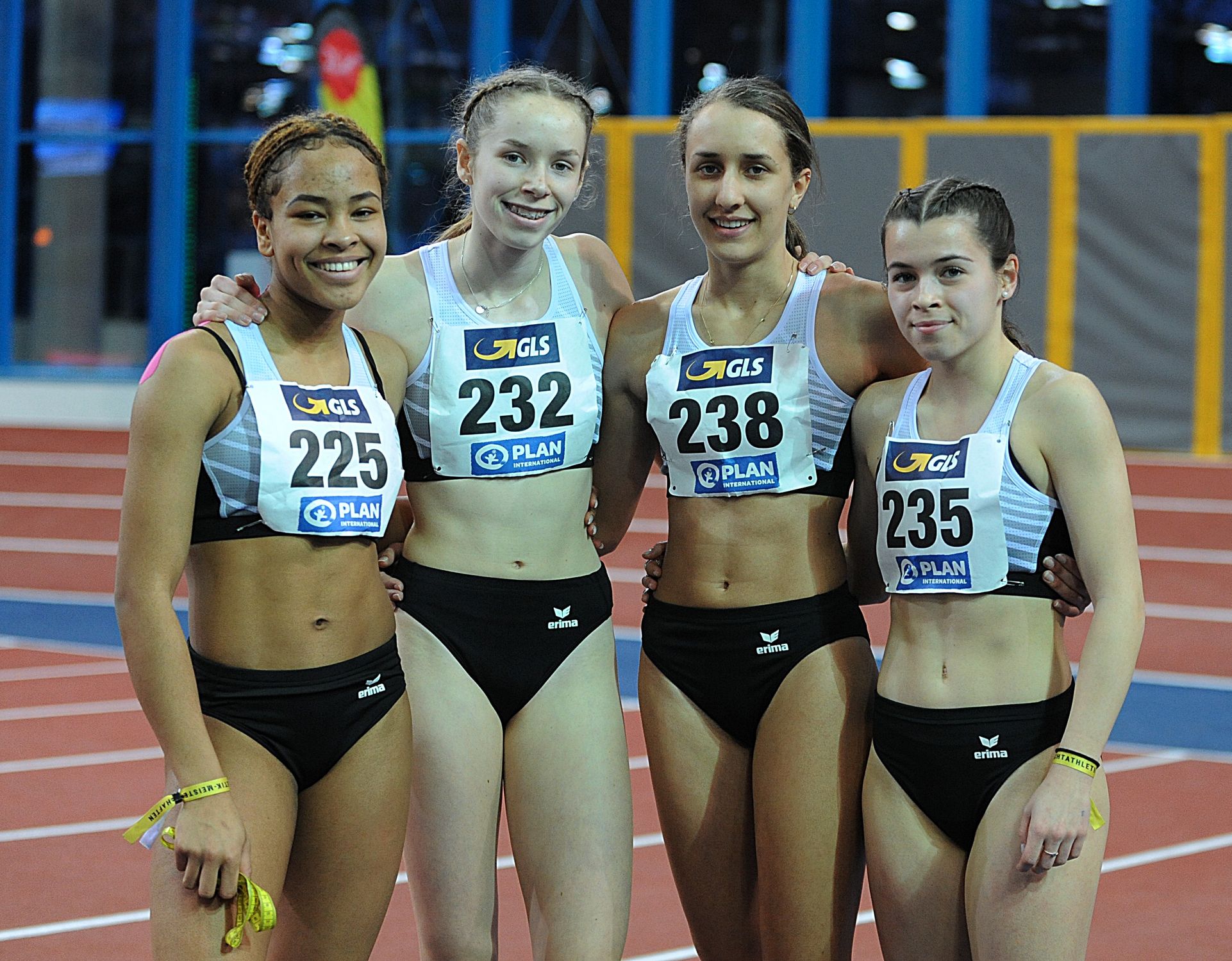Richtig viel los war auf der Rundbahn bei den Staffelrennen über 4x200 Meter, stritten doch hier 23 Team um die acht Plätze im A- bzw. B-Finale. Im zweiten Rennen flitzten die Mädels der LG Eintracht Frankfurt um das Tartanoval. Das Quartett in der Besetzung Charlize Boykin, Nele Kühn, Alisha Zwergel und Anne Schröder macht in 1:41,65 Minuten den Einzug ins A-Finale perfekt. Die identische Truppe schaltete hier dann nochmals einen Gang hoch und steigerte sich auf tolle 1:40,58 Minuten. Das reichte aber leider nicht zum erhofften Edelmetall, denn die Mädels von LAV Bayer Uerdingen/Dormagen waren winzige 0,05 Sekunden flotter unter unterwegs und holten damit die Bronzemedaille.