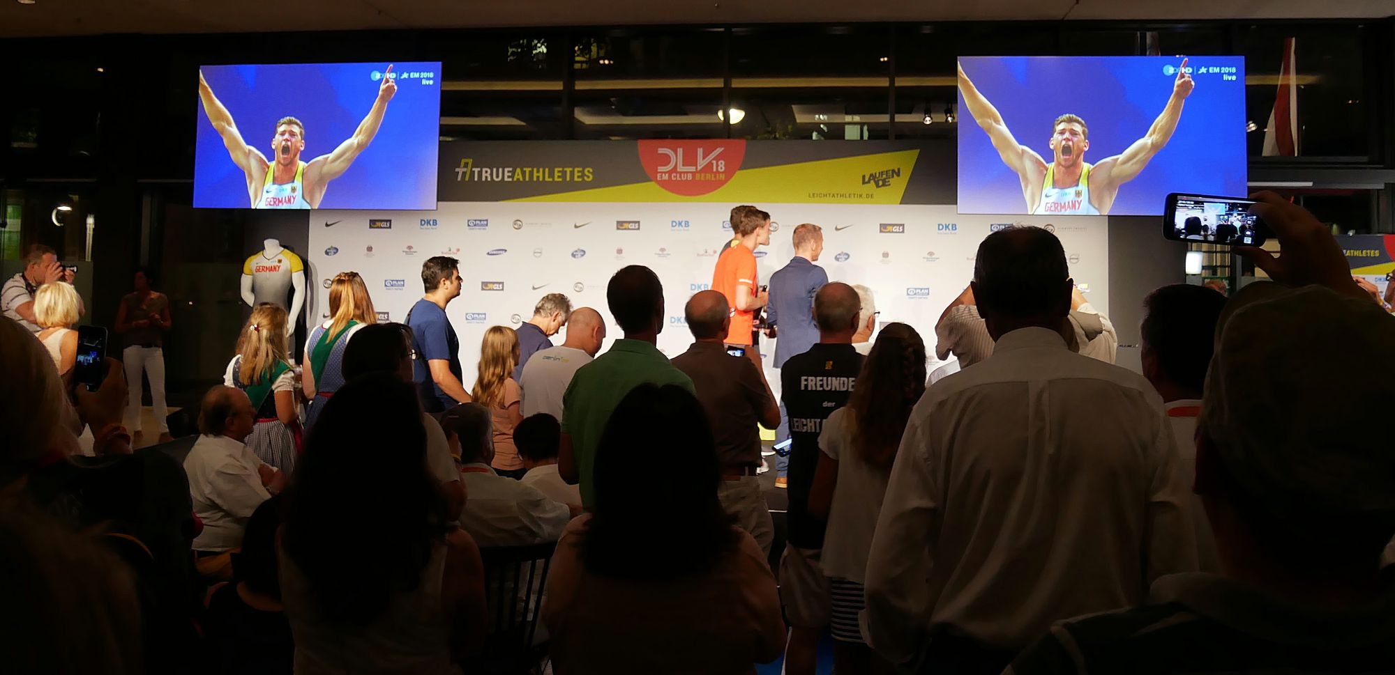 Der EM-Club des Deutschen Leichtathletik-Verbandes im Hotel Interconti war stets gut und prominent besucht. Seit Dienstag wurden hier spätabends die vielen deutschen Medaillengewinner und besser Platzierten auf der Bühne von Markus Othmer interviewt, anschließend gab es ein Sponsoren-Präsent und zum guten Schluss alkoholfreies Bier aus einem XXL-Glas. Bis etwa zwei Uhr nachts wurde im EM-Club auch unter Funktionären im besten Sinne genetzwerkt - den Hessischen Leichtathletik-Verband repräsentierten an der Spitze die Präsidentin Anja Wolf-Blanke sowie die Vizepräsidenten Klaus Schuder und Sven Lindemann.
