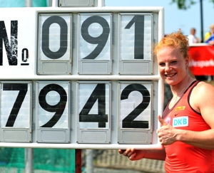 Großer Erfolg für Betty Heidler, die LG Eintracht Frankfurt und die hessische Leichtathletik: Die Hammerwurf-Weltrekordhalterin ist zur „Leichtathletin des Jahres“ gewählt worden. Abgestimmt hatten die Leser der Fachzeitschriften „leichtathletik“ und „Leichtathletik INFORMation“ sowie die User des Internet-Portals „leichtathletik.de“. Abgegeben wurden mehr als 15.000 Stimmen, davon entfielen 27 Prozent auf Heidler. Rang zwei ging an Stabhochsprung-Vizeweltmeisterin Martina Strutz (ESV Hagenow/23,3%). Auf Rang neun wurde Marathonläuferin Irina Mikitenko (SC Gelnhausen/2,8%) gewählt. Das Votum bei den Männern fiel noch eindeutiger aus, 39,4 Prozent entschieden sich für Kugelstoß-Weltmeister David Storl aus Chemnitz. Jan Felix Knobel von der LG Eintracht Frankfurt, WM-Achter im Zehnkampf, erreichte den vierten Platz (9,6%). Ähnlich deutlich verlief die Publikumswahl zum „Jugend-Leichtathleten des Jahres“. Gesa Felicitas Krause (LG Eintracht Frankfurt) kam mit 33,3 Prozent der Stimmen klar auf Platz eins. Die WM-Neunte über 3.000 Meter Hindernis setzte sich damit ebenso durch wie Hürdensprinter Gregor Traber (LAV Tübingen).