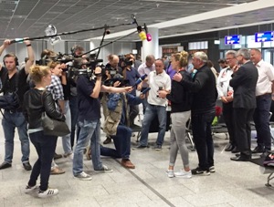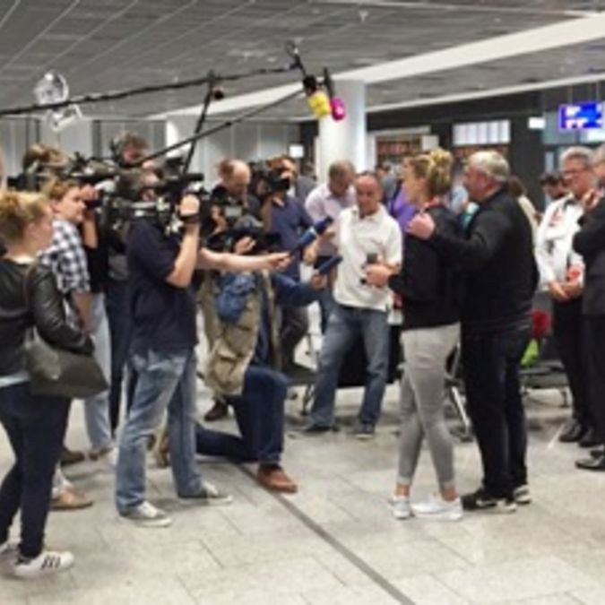 Siebenkampf-Silbermedaillengewinnerin Carolin Schäfer und ihr Trainer Jürgen Sammert sind auf dem Frankfurter Flughafen begeistert empfangen worden. Zu den Gratulanten bei der Rückkehr von der WM in London gehörten auch HLV-Vizepräsident Leistungssport Martin Rumpf, Eintracht-Abteilungsleiter Wolfram Tröger und Fraport-Vorstandsmitglied Michael Müller. Und eine solche Medienpräsenz wie bei der Ankunft der 25-Jährigen gab es noch selten in den vergangenen Jahren für die Leichtathletik. Am Start waren RTL, Sat.1, Hessischer Rundfunk, Rhein-Main TV sowie Eintracht TV. Und natürlich Print- und Hörfunk-Journalisten. Ja, sagte Carolin Schäfer, sie habe nach dem Medaillengewinn („Das lange ersehnte Stück“) viel geschlemmt. Im entspannten Essens-Modus könnte es noch eine Zeitlang weitergehen, denn Rumpf überbrachte nicht nur die Glückwünsche des HLV, sondern auch einen Pizza-Gutschein für die Weltklasse-Athletin und ihren Trainer. Sammert sieht perspektivisch durchaus Reserven im Leistungsbild von Carolin Schäfer, insbesondere am zweiten Tag. Was zu einem Angriff auf den 25 Jahre alten deutschen Rekord von Sabine Braun (TV Wattenscheid/6.985 Punkte) führen könnte. Die persönliche Bestleistung der gebürtigen Nordhessin Carolin Schäfer liegt bei 6.836 Punkten. „Ich weiß gar nicht, wer mehr strahlt, meine silberne Medaille oder ich? Der Dank geht an meine Sponsoren, an meine langjährigen Wegbegleiter, Familie und Freunde! Wir haben es geschafft, ich bringe Silber mit nach Hause“, schrieb die Siebenkämpferin auf ihrem offiziellen Facebook-Account. (tin.)