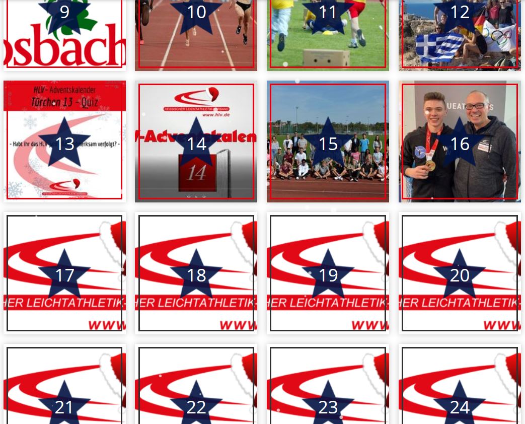 Wir begleiten die Adventszeit mit unserem HLV-Adventskalender. Hinter jedem der 24 Türchen versteckt sich eine Überraschung mit einem bunten Mix rund um die hessische Leichtathletik.