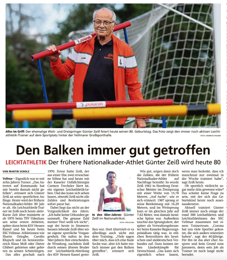 Wie gut, zeigen dann doch die Zahlen, die der frühere Nationalkader-Athlet auf Nachfrage bemüht: So wurde Zeiß 1962 in Hamburg Deutscher Meister im Dreisprung mit einer Weite von 15,78 Metern. „Auf Asche“, wie er sich erinnert. 1967 sprang er seine Bestleistung mit 16,29 Metern, und im Weitsprung kam er im gleichen Jahr auf 7,62 Meter, was damals hessische Spitze war. Außerdem tauchte das Sprungtalent, der später als Verwaltungsbeamter beim Kasseler Regierungspräsidium tätig war, in etlichen Bestenlisten des hessischen und süddeutschen Verbandes auf. Dazu kamen sieben Länderkämpfe für Deutschland. „Das kann sich eigentlich sehen lassen, wenn man bedenkt, dass ich manchmal nur zweimal in der Woche trainiert habe“, sagt Zeiß heute.