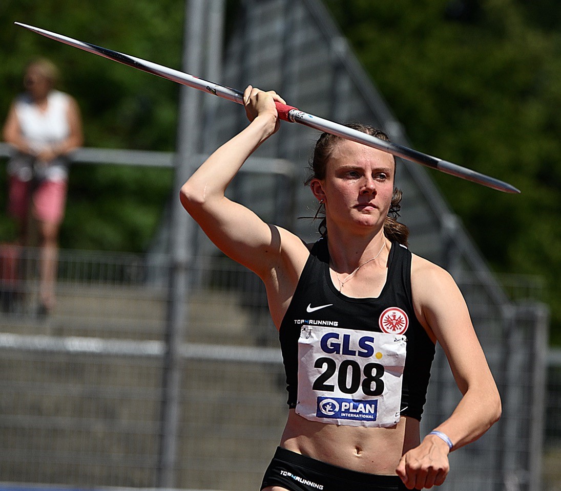 Dass Jana Marie Lowka eine klare Anwärterin auf eine Speerwurf-Medaille war, belegte ein Blick in die Meldeliste. Dort wurde die Eintrachtlerin mit 58,75 Metern auf dem zweiten Platz geführt. So weit ging es diesmal nicht. Doch mit 53,11 Metern im vierten Durchgang von Jana Marie war Lea Wipper (SC Magdeburg) ihre Führung los, die sie gleich mit ihrem ersten Wurf bei 52,83 Metern markiert hatte. An dieser Konstellation änderte sich dann auch bis zum Wettkampfende nichts mehr. Pech hatte Lilly Urban (ebenfalls Eintracht), die bis zum Beginn der sechsten Runde mit 50,61 Metern auf dem dritten Platz lag. Die Adlerträgerin wurde auf den letzten Drücker noch von Leonie Tröger (Hallesche Leichtathletik Freunde/51,87 m) abgefangen und auch die U20-Athletin Josefa Schepp (TSV Bayer Leverkusen/50,75 m) zog noch vorbei.