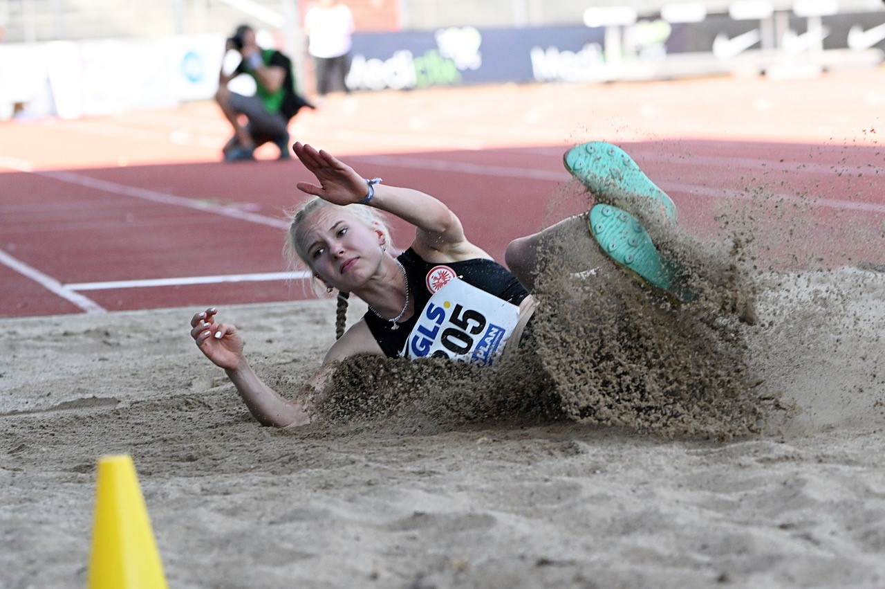 Ähnlich wie Urban erging es beim Weitsprung auch Malin Stavenow, die ebenfalls das Eintracht-Trikot trägt. Nach einem ungültigen Versuch zum Auftakt flog die SGElerin auf 6,07 Meter und damit in die Medaillen-Ränge. Dann zauberte Lokalmatadorin Nicola Kondziella (TV Wattenscheid) ganz starke 6,39 Meter in die Grube. Dann legte Mikaelle Assani (LG Region Karlsruhe) mit 6,17 Meter nach. Mit ihrem letzten Satz auf 6,08 Meter schob sich mit einem winzigen Zentimeter Vorsprung dann auch noch Alina Juliette Heinzmann (LG Region Karlsruhe) hauchdünn vor Stavenow. Für Finja Köchling (auch Eintracht/10.) endete die DM im Vorkampf mit 5,75 Metern.