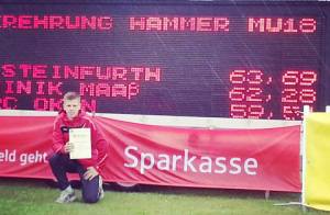 Am 27. Juli hat der Filius das fünf Kilogramm schwere Gerät in Haßloch/Pfalz 65,74 Meter weit geschleudert und rückte damit dem deutschen Jahresbesten Dominik Maaß (LAV Neustadt/66,42) noch ein Stück näher. „Alles ist möglich, auch der Titel“, sagt Vater und Trainer Klaus Steinfurth. „Wenn der Wettkampf normal läuft, machen diese beiden den Sieg unter sich aus.“ Ein Vorteil seines Sohnes: Die vier direkten Duelle in diesem Jahr hat Konstantin Steinfurth 3:1 für sich entschieden und mit den Siegen bei den Wurfklassikern in Halle an der Saale und in Fränkisch-Crumbach auch den deutschen Junioren-Cup gewonnen. Verglichen mit seinem Konkurrenten aus Bayern ist Steinfurth Junior ein Leichtgewicht - physisch bewertet. Auf 1,85 Meter verteilen sich 76 Kilogramm. „Eigentlich ist er ein ziemlicher Hänfling“, sagt der Vater. „Dabei hat er im Vergleich zum vergangenen Jahr schon fünf Kilogramm zugelegt.“ Im Sommer 2013 flog der Hammer des Jugendlichen im Trikot der LG Eppstein/Hornau 57,47 Meter weit. Seitdem hat der Carl-von-Weinberg-Schüler (Frankfurt) acht Meter drauf gepackt.