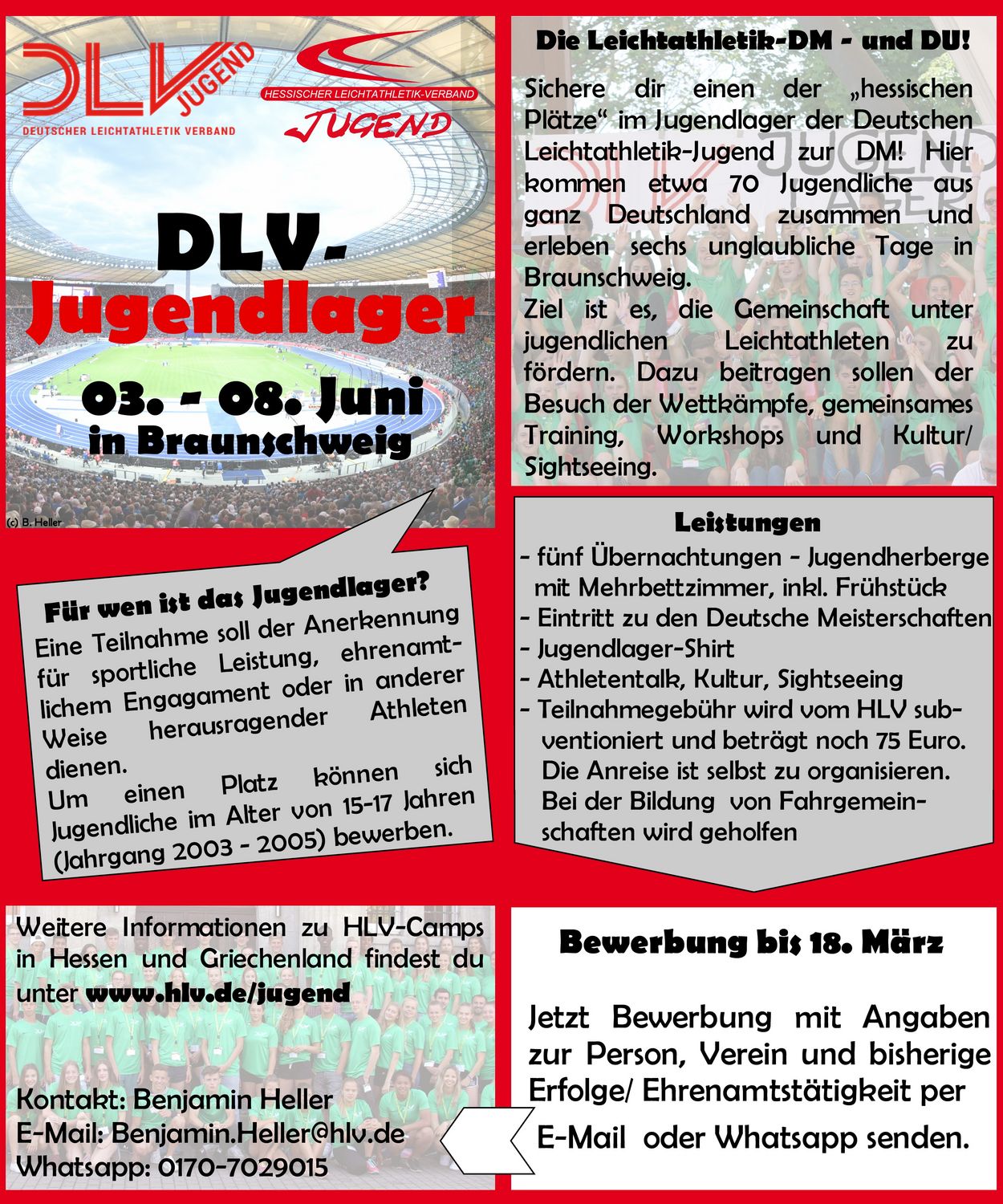 Auch in diesem Jahr findet im Rahmen der Deutschen Meisterschaften in Braunschweig (6./7. Juni) wieder das DLV-Jugendlager statt. Aus jedem Landesverband Deutschlands kommen hier jugendliche Athleten zusammen und verbringen eine sport- und erlebnisreiche Zeit! Der Hessische Leichtathletik-Verband kann vier Jugendliche entsenden und zwei weitere Nachrücker benennen, sollte ein anderer Landesverband seine Plätze nicht aufbrauchen. Dazu schreibt die HLV-Jugend diese Plätze für hessische Teilnehmer/innen der Jahrgänge 2003, 2004 und 2005 aus und freut sich über die Bewerbungen der Athleten. Das Jugendlager dient der Anerkennung sportlicher Leistung, geleisteter Jugendarbeit oder in anderer Weise herausragender Athleten. Daher wünschen wir uns viele Bewerbungen von interessierten Jugendlichen im entsprechenden Alter! Das DLV-Jugendlager findet vom 03. bis 08. Juni 2020 in Braunschweig statt - alle Informationen und Kontaktmöglichkeiten befinden sich im Flyer (siehe rechts).
