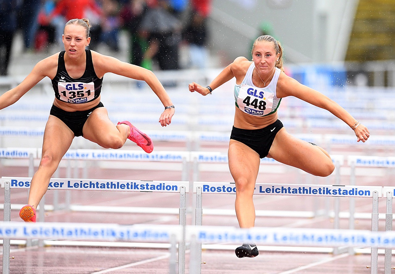 Dreisprung: Nichts für schwache Nerven war die Entscheidung beim „Hopp-Stop-Jump“, denn lediglich ein winziger Zentimeter entschied hier die deutsche Meisterschaft. Favoritin Masha-Sol Gelitz (GSV Eintracht Baunatal/schon 12,67 m) hatte im zweiten Durchgang 12,27 Meter vorgelegt und war damit an die Spitze gesprungen. In der fünften Runde wurde es dann ganz knapp, denn Berenike Roos (TV Wattenscheid) rückte Masha-Sol mit 12,26 Metern ganz dicht auf die Pelle. Bei dieser Konstellation blieb es dann auch, denn in der finalen Runde gab es an der Spitze keine Veränderungen mehr.„Bei dem Wetter war es natürlich schwierig, zu springen. Mir hat es etwas an Schnelligkeit gefehlt“, kommentierte Masha-Sol die Regenschlacht von Rostock. Ein massiver Wolkenbruch führte sogar zu einer Unterbrechung des Wettkampfes. Die Zwangspause brachte Gelitz jedoch nicht aus dem Konzept.