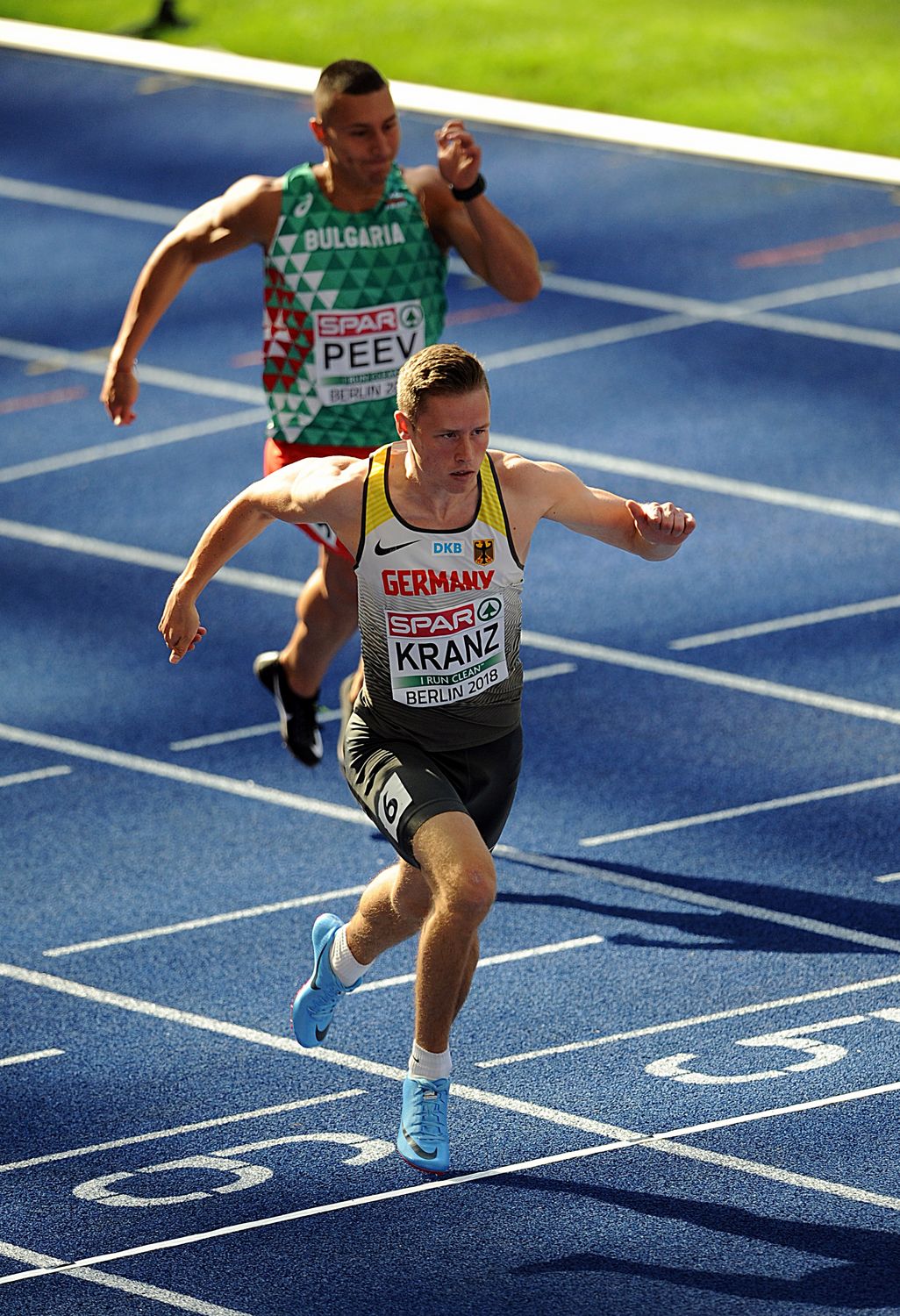 Ein paar Minuten, konkret waren es zwölf, gab es Hoffnung für Kevin Kranz. Hoffnung, noch ins 100-Meter-Halbfinale einzuziehen. Obwohl der 20-jährige deutsche Meister vom Sprintteam Wetzlar in seinem Vorlauf lediglich Fünfter geworden war - in 10,41 Sekunden. Fünf Rennen der ersten Runde gab es am Montagnachmittag bei der Leichtathletik-EM im Berliner Olympiastadion, jeweils die beiden Besten und fünf weitere Zeitschnellste qualifizierten sich für das Halbfinale. Für Kranz als bislang Viertzeitschnellsten gab es vor dem abschließenden fünften Rennen durchaus eine Chance, noch eine Runde weiter zu kommen. Herausgekickt aus seiner ersten EM, dem ersten Wettkampf im Nationaltrikot, wurde der Polizeikommissar-Anwärter dann vom Niederländer Hensley Paulina (10,34) sowie vom Italiener Federico Cattaneo (10,39). Kranz, um es faktisch auf den Punkt zu bringen, war zwei Hundertstel zu langsam.