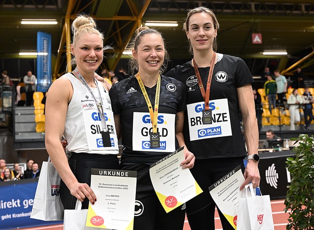 Dreisprung: Eine famose Steigerung gelang hier Kira Wittmann (LG Göttingen), die ihren Hausrekord um gleich 0,39 Meter verbessern konnte, mit 14,08 Metern erstmals eine „14er-Weite“ zeigte und damit den Titel holte. Dahinter sortierten sich Maria Purtsa (LAC Erdgas Chemnitz/13,84 m) sowie Kirstin Giersch (TSV Bayer 04 Leverkusen/13,80 m) ein. Nach drei Versuchen musste Nathalie Buschung ihre Spikes wieder einpacken. Es war aber eine knappe Angelegenheit, denn der Eintracht-Springerin fehlten mit 12,56 Metern (9.) lediglich zehn Zentimeter für drei weitere Versuche im Finale.