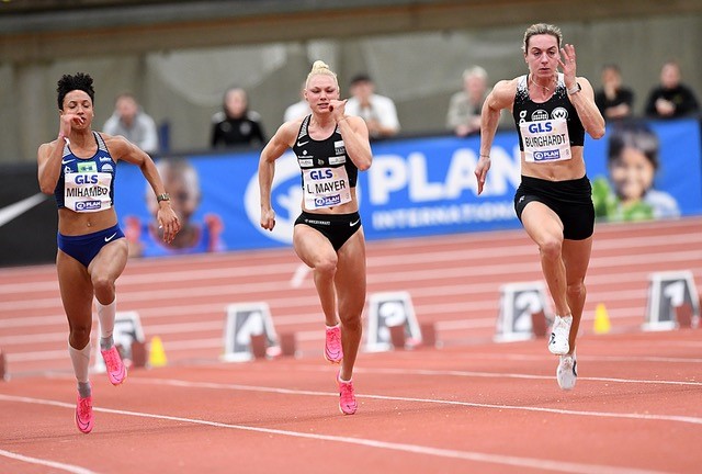 60 Meter: Hier gab es das erwarte Edelmetall. Lisa Mayer (Sprintteam Wetzlar) wurde in starken 7,21 Vizemeisterin, blieb nur um 0,01 Sekunden über ihrer Saisonbestmarke und musste lediglich ihrer Nationalteam-Kollegin Gina Lückenkemper (SCC Berlin/7,17 sec.) den Vortritt lassen. Lisa gewann mit 7,38 Sekunden ihren Vorlauf und steigerte sich im Halbfinale auf 7,26 Sekunden. Die Form für die Hallen-EM in Istanbul stimmt also. Antonia Dellert (ebenfalls Sprintteam Wetzlar) belegte nach 7,38 Sekunden den fünften Platz. Ein toller Erfolg für die jüngste Athletin (U23) im Feld, die in den beiden ersten Runden jeweils 7,41 Sekunden zeigte.
