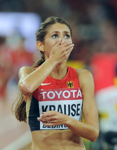 Sie wollte einen Platz zwischen sechs und acht erreichen. Und dann wird sie im „Vogelnest“ von Peking plötzlich WM-Dritte. Gesa Felicitas Krause von der LG Eintracht Frankfurt hat in einem von der Taktik geprägten Finale über 3.000 Meter Hindernis geduldig gewartet und nach dem dem letzten Wassergraben ihre Chance auf´s Podium genutzt. In 9:19,25 Minuten verbesserte die 23 Jahre junge Hessin aus Dillenburg ihre persönliche Bestleistung um neun Zehntelsekunden und rannte hinter Hyvin Kiyeng Jepkemoi (Kenia/9:19,11) und der Jahresweltbesten Habiba Ghribi (Tunesien/9:19,24) ins Ziel. Dem deutschen Rekord von Antje Möldner-Schmidt bei der WM 2009 in Berlin (9:18,54) kam Gesa Krause noch näher als im Juli in Monaco (9:20,15). Davor hatte sie fast drei Jahre vergeblich versucht ihre Zeit aus dem Olympia-Finale 2012 in London (9:23,52) zu verbessern. In Peking sorgte Gesa Felicitas Krause für die fünfte deutsche WM-Medaille bei den 15. Welttitelkämpfen nach dem Sieg von Christina Schwanitz, Platz zwei von David Storl (beide Kugelstoßen), einem weiteren zweiten Rang von Raphael Holzdeppe (Stabhochsprung) sowie Diskuswerferin Nadine Müller, die nach Platz zwei 2011 dieses Mal Dritte wurde.<ENDE/>