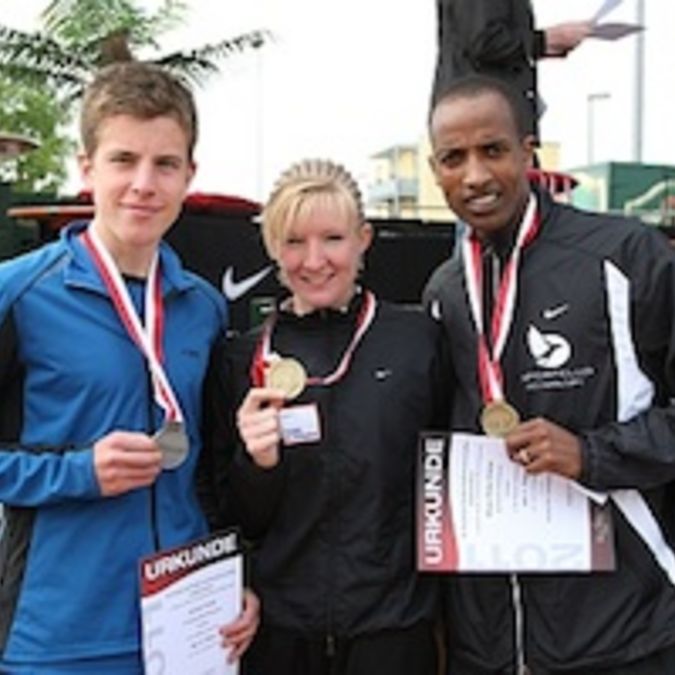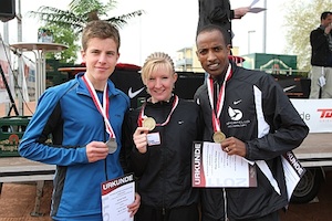 Die deutschen Halbmarathonmeister 2011 heißen André Pollmächer und Sabrina Mockenhaupt. Der Chemnitzer zog nach einem spannenden Rennverlauf auf den beiden Schlusskilometern das Tempo resolut an, konnte dadurch seinen hartnäckigen Konkurrenten Musa Roba-Kinkal abschütteln und mit 1:04:16 Stunden als deutscher Meister ins Ziel im Griesheimer Stadion einlaufen. Der Gelnhäuser Debütant folgte mit 14 Sekunden Rückstand und sicherte sich somit den Juniorentitel. Bei den Frauen meldete sich noch am Morgen Sabrina Mockenhaupt nach – und ließ sich den Titel, übrigens der erste auf der Halbmarathondistanz und 29. ihrer imposanten Meisterschaftssammlung, weder von Susanne Hahn noch von der indisponiert wirkenden Titelverteidigerin Ingalena Heuck streitig machen. <ENDE/> Pollmächer: „Rennen wie erhofft!“ „Das Rennen ist so gelaufen, wie ich es mir auch erhofft habe!“ freute sich André Pollmächer. Der Chemnitzer im Dress des Rhein-Marathon Düsseldorf hatte gerade wenige Minuten zuvor sein Comeback mit dem Gewinn des Halbmarathon-Titels in persönlicher Bestzeit von 1:04:16 Stunden gekrönt. „Aber die Konkurrenz ist ganz schön stark gewesen!“ applaudierte er der kampfstarken Konkurrenz, die erst auf den letzten drei, vier Kilometern der stärker werdenden Schlagzahl des Schützlings von Bundestrainer Ron Weigel nachgeben musste. Mit dem Halbmarathon-Debütanten Musa Roba-Kinkal (SC Gelnhausen) und Titelverteidiger Stefan Koch (LG Braunschweig) blieben zwei weitere Läufer mit 1:04:30 bzw. 1:04:55 Stunden unter der 1:05-Stunden-Marke. Auf der 2,5 km langen Pendelstrecke auf der Bundesstraße 26 durch Griesheim entwickelte sich vom Start weg ein spannendes Ausscheidungsrennen mit einer zumeist sechsköpfigen Spitzengruppe. Neben Pollmächer, Roba-Kinkal und dem zeitweise etwas nachhängenden Koch gehörten dieser Gruppe überraschend der 23jährige Hagen Brosius (SCC Berlin), Sören Kah (LG Lahn-Aar-Esterau) und Maciek Miereczko (FV Citylauf Erftstadt) an. Stefan Koch, der nach 11 km sogar gestürzt war, zog nach 15 km das Tempo etwas an und läutete damit die Rennentscheidung – und damit das reizvolle Duell André Pollmächer gegen Musa Roba-Kinkal ein. „Das hat wirklich Spaß gemacht. Vor allem konnte ich im Rennen einmal ausreizen, was derzeit möglich ist“, analysierte Pollmächer seine Leistung. „Ich denke, eine deutsche Meisterschaft in 1:04:16 zu gewinnen, ist doch nicht zu schlecht!“ Musa Roba-Kinkal – ein Mann mit Straßen-Perspektiven Während für André Pollmächer die Phase der Unterdistanzrennen nach der Vorstellung seines Trainers Ron Weigel noch bis zum Sommer weiter gehen soll, blickt Musa Roba-Kinkal bereits in Richtung 400 m-Kunststoffbahn. „Ich habe mit einer 65er Zeit gerechnet und bin deshalb mehr als zufrieden mit den 1:04:30 Stunden. Ich bin mutig ins Rennen gegangen und das hat sich gelohnt. Eigentlich bin ich nicht schwächer als André, aber den Ausschlag heute hat die Erfahrung gebracht, die er mir gegenüber auf der Halbmarathonstrecke hat!“ Der 23jährige wird sich rasch erholen müssen, denn bereits in drei Wochen stehen die deutschen 10.000 m-Meisterschaften in Essen auf dem Wettkampfplan. „Ich denke nicht, dass das Rennen wie im Vorjahr in Ohrdruf sehr schnell wird. Eine schnelle Zeit kann ich vielleicht bei der U 23-EM laufen. Dort möchte ich den Titel holen!“ Mittelfristig sieht Musa Roba-Kinkal aber auch eine gute Perspektive auf der Straße. Stefan Koch: „Setze auf Hamburg“ Ganz im Gegensatz zu den beiden Erstplatzierten hätte sich Stefan Koch gerne ein langsameres Rennen gewünscht. „Zwei Wochen nach dem Halbmarathon in Berlin wollte ich eigentlich etwas lockerer laufen. Aber das ging ja heute nicht. Da ich mich in der Vorbereitung auf Hamburg befinde, war mir das Rennen etwas zu schnell!“ Dennoch freute sich der Braunschweiger über die Bronzemedaille, die er sich mit einem starken Finish erlaufen konnte. „Für mich zählt in erster Linie aber der Titel in Hamburg in hoffentlich neuer Bestzeit!“ Bundestrainer Weigel sieht einen „Ruck durch die Marathonszene“ Marathon-Bundestrainer Ron Weigel verspürt derweil schon einen „Ruck in der Marathonszene“, wie er in einer Art ersten Zwischenbilanz in Griesheim formulierte. „So, wie es im vergangenen halben Jahr bereits angelaufen ist, imponiert mir! Daran müssen wir aber anknüpfen. Wir können uns nur in Trainingsgruppen weiter entwickeln. Bestes Beispiel ist für mich Hagen Brosius“. Der junge Berliner im Trikot des SC Charlottenburg spielte in der Spitzengruppe um André Pollmächer eine vorzügliche Rolle, war immer wieder als Tempomacher als Kopf der Fünfergruppe zu finden, wurde allerdings als Vierter knapp um eine Medaille gebracht. „Oh, ich bin mit meinem Lauf sehr zufrieden. Das Training mit André hat sich bereits ausgezahlt!“ freute sich der 23jährige Student, der als „Juniorpartner“ von André Pollmächer in Potsdam vom strukturierten Training profitiert. Sabrina Mockenhaupt: „Rennen für den Kopf“ Bei den Frauen bestimmte von Beginn an die kleine Siegerländerin das Tempo – und keiner wollte auch nur im Ansatz mitgehen. Bei der 5 km-marke wurden 16:23 Minuten notiert. „Das war natürlich viel zu schnell. Aber ich wollte einfach einmal befreit laufen, ohne Druck und nur einfach Spaß haben!“ Gesagt, getan. Nach dem verkorksten Rennen in Berlin sollte die Halbmarathon-Meisterschaft in Griesheim nun als Aufbau- und Motivationsrennen gelten. „Berlin war in jeder Hinsicht zu viel. Ich hatte mir auch zu viel Druck aufgebaut, das muss künftig wieder anders werden. Ich muss meine Rennen in Ruhe vorbereiten und mich nicht von außen steuern lassen!“ Bundestrainer Ron Weigel hatte deshalb auch am Sonntagmorgen am Nachmeldeschalter die Startnummer besorgt, Sabrina war lediglich mit ihrem Bruder („bei guter Musik“, bekannte sie) nach Griesheim gefahren und sich an die Startlinie gestellt. „Nach dem Trainerwechsel w