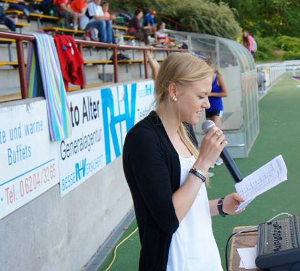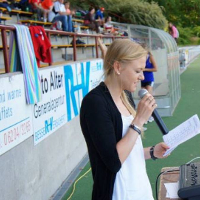 Zufälliges Zusammentreffen Und dem Zufall. Bei den hessischen Staffelmeisterschaften in Wehrheim im letzten Juni moderierten Chantal Buschung und Artur Schmidt erstmals Seite an Seite – ungeplant wohlgemerkt. Der Herborner wollte eigentlich nur seinen Enkel über 3x800 Meter anfeuern. Dann bot er seine Unterstützung bei den Sieger-Interviews an. „Ich kannte ihn zuerst gar nicht, aber es war offensichtlich, dass er nicht zum ersten Mal moderiert“, erinnert sich Chantal Buschung. Sie machte ihre Sache so gut, dass der erste „offizielle“ gemeinsame Einsatz beim Herborner Sportfest nicht lange auf sich warten ließ. Im November kam von Schmidt schließlich das Angebot ihn in Markt Indersdorf zu unterstützen. „Da sagt man natürlich nicht Nein“, so die Hessin vor ihrem bisher bedeutendsten Auftritt. Angefangen hat alles natürlich viel kleiner, mit der Moderation einer Tombala auf einem Ortsfest. „Alle waren total begeistert“, erinnert sich Chantal Buschung, die damals 15 war. Mehr kam dann erst einmal nicht und es verging einige Zeit. Bis es im April 2013 auf der HLV-Homepage hieß: Sprecher gesucht! Einfach mal reinschnuppern, dachte sich die Heringerin. Der Workshop hat ihr so gut gefallen, dass sie danach richtig durchstartete. Hessenmeisterschaften, Kreismeisterschaften, Vereinssportfeste. Knapp 50 Einsätze als Sprecherin bei Leichtathletikveranstaltungen sind mittlerweile wohl schon zusammengekommen, schätzt sie. „Und jedes Mal lerne ich dazu“, sagt die süddeutsche W15-Meisterin Weitsprung von 2007 (5,52 Meter). „Vor dem ersten Satz kribbelt es wie bei einem Wettkampf. Danach legt sich die Nervosität. Und vieles kann man sowieso nicht planen.“ Chaos-Meisterschaften als „Sprung ins kalte Wasser“ Wie bei den hessischen Jugendmeisterschaften 2013 in Baunatal. Regen, Sturm, Chaos, Abbruch. „Das war der sprichwörtliche Sprung ins kalte Wasser. Keiner wusste, wie es weitergeht.“ Die Athleten waren sauer, die Kampfrichter im Stress und die Sprecher Sven Eichel (Vellmar) und Chantal Buschung mittendrin. „Wir haben informiert, Hoffnung verbreitet und viel improvisiert“, erinnert sich die ehemalige Sprinterin mit Bestzeiten von 12,23 Sekunden (100 Meter) und 25,05 Sekunden (200 Meter/beide 2010). Geholfen haben zum Beispiel Lieder mit „Regen“ und „Rain“ im Titel, schnell zusammengesucht bei Youtube. Chantal Buschung mag die Herausforderungen, die jede Moderation mit sich bringt. Die Stimmung einer Veranstaltung auffangen, die Athleten emotional abholen - „Moderieren lernt man nur durch moderieren.“ Die Vorbereitungen gehen mittlerweile schneller. Chantal Buschung legt Schwerpunkte, konzentriert sich auf die Hauptakteure („Mit zu vielen Informationen würde ich in den Zeitplan eingreifen“) und weiß den Vorteil zu schätzen selbst noch aktiv zu sein. „Da kenne ich die meisten.“ Mit einem „Sprung über eine Klippe“ vergleicht Chantal Buschung das Thema Humor beim Ansagen. Ganz wichtig: er muss zur Veranstaltung passen, darf nicht gekünstelt wirken oder verletzend sein. „Ich entwickle allmählich ein Gefühl, wann ich bestimmte Ereignisse humoristisch aufgreifen kann.“ Sehr gut eignen sich Schnapszahlen bei Zeiten und Weiten. Dass die Reaktionen gespalten ausfallen können, darüber ist sich die Dreispringerin („Springen ist ein Ausdruck der Freude“) bewusst. „Die einen finden es toll, die anderen total daneben.“