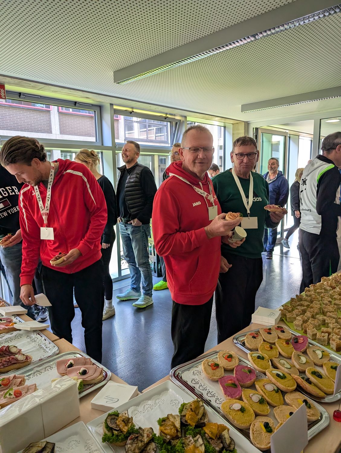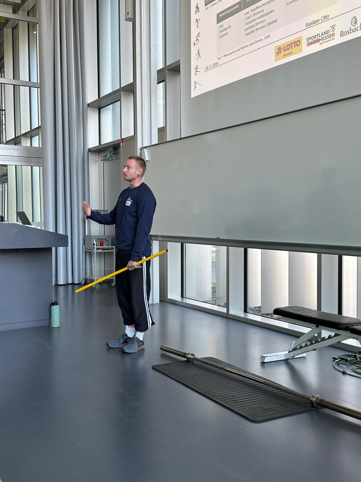 Im Anschluss begann die erste von zwei Workshopphasen. Dort wurden die Teilnehmenden in vier Workshops aufgeteilt. Der Trainingswissenschaftler vom OSP Hessen, Stefan Erlewein, thematisierte in seinem Workshop die Speerwurftechnik. Bei der ehemaligen, sehr erfolgreichen Hammerwerferin Kathrin Klaas, stand die Hammerwurftechnik im Fokus. Dabei konnten die Teilnehmenden die Technik in Teilschritten ausprobieren und am Ende mit einem Übungs-Wurfhammer einen Wurf selbst durchführen. Martin Rumpf erläuterte im dritten Workshop die Grundlagen der Drehstoßtechnik. Der vierte Workshop wurde von Heilpraktiker und Osteopath Peter Ringeisen mit dem Schwerpunkt "Verletzungsprophylaxe für Werfer:innen" gehalten. Im Fokus standen Übungen mit verschiedenen Trainingsmitteln zur Prävention von Verletzungen. Außerdem wurden viele Fallbeispiele von den anwesenden Teilnehmenden diskutiert und gemeinsam nach Lösungsansätzen gesucht.
