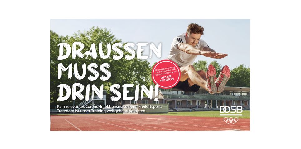 Mit dem Motto "Draußen muss drin sein" fordert die gemeinsame Initiative von Deutschem Olympischem Sportbund (DOSB) und Deutschem Fußball-Bund (DFB) die schnellstmögliche Wiederzulassung des organisierten Sportbetriebs unter freiem Himmel, zunächst im Training, anschließend im Wettkampfbetrieb. Aufgerufen die Online-Petition zu unterstützen, um dem Amateur- und Breitensport eine gemeinsame Stimme zu geben, sind Mitglieder, Vereine und Verbände aller Sportarten sowie alle Sportbegeisterte in Deutschland.