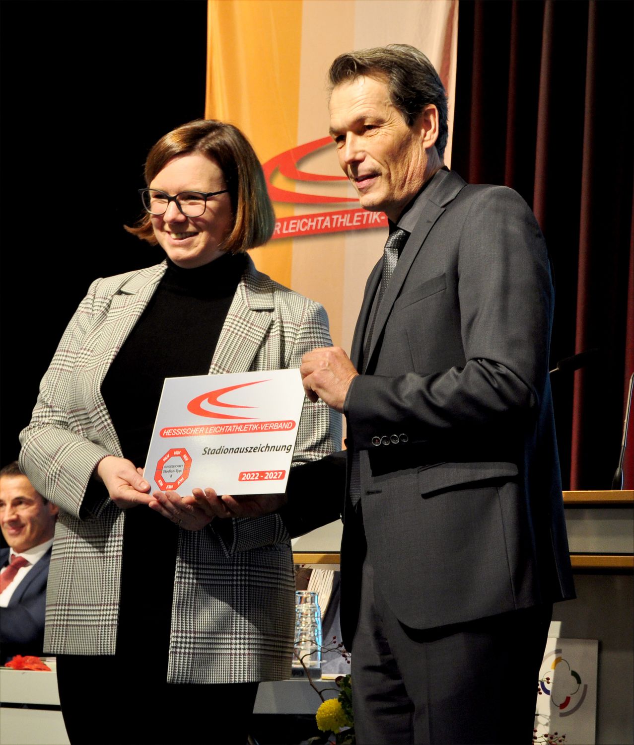 Neben den Wahlen wurden zudem Ehrungen durchgeführt. So erhielt Erich Schneider die goldene Ehrennadel des DLV und Wolfgang Raatz die silberne Ehrennadel des HLV. Thomas Seybold wurde für seine Tätigkeit als Geschäftsführer im 33. Jahr gewürdigt und Bürgermeisterin Manuela Strube nahm die Stadionauszeichnung für das Parkstadion in Baunatal entgegen.