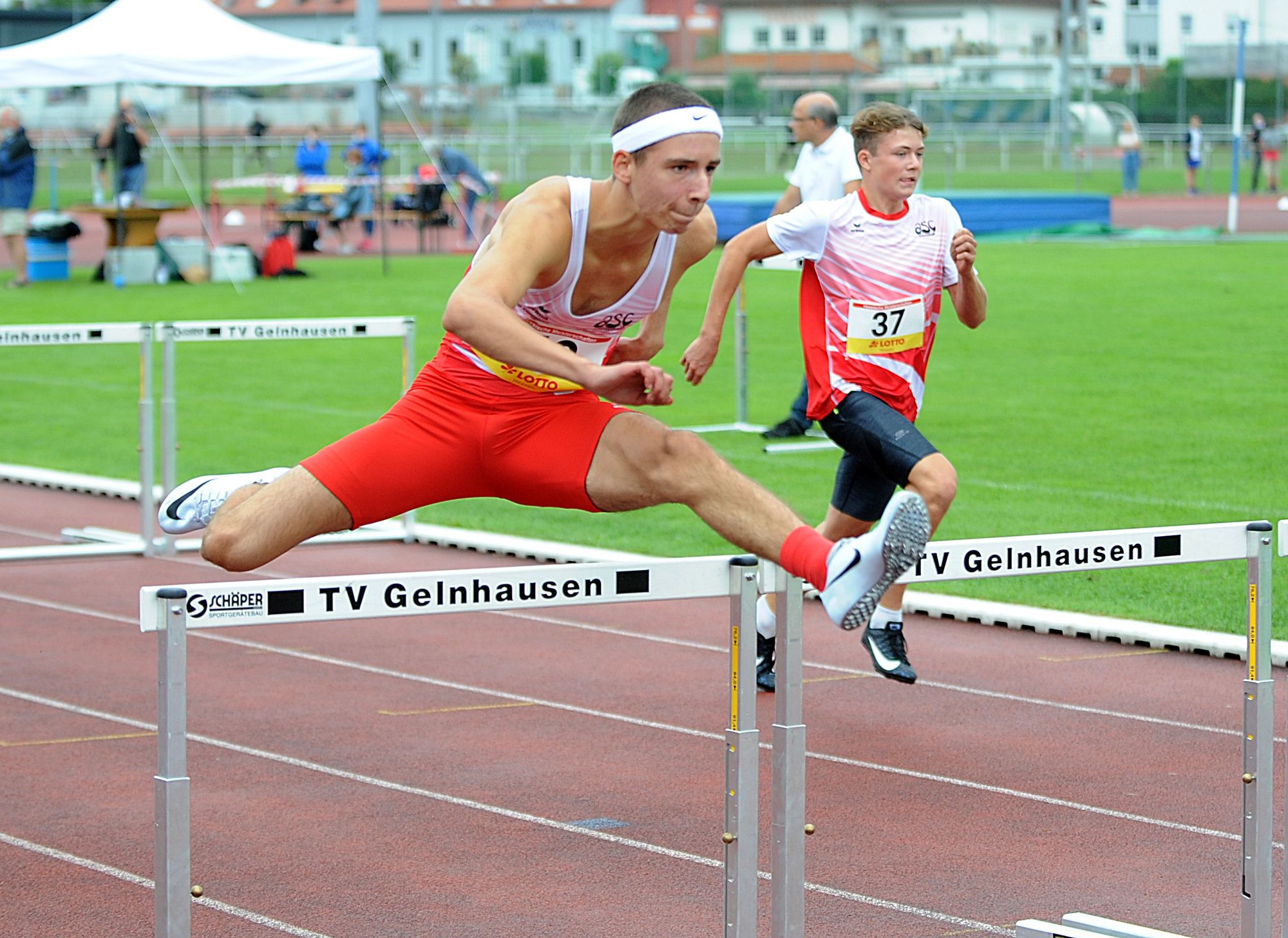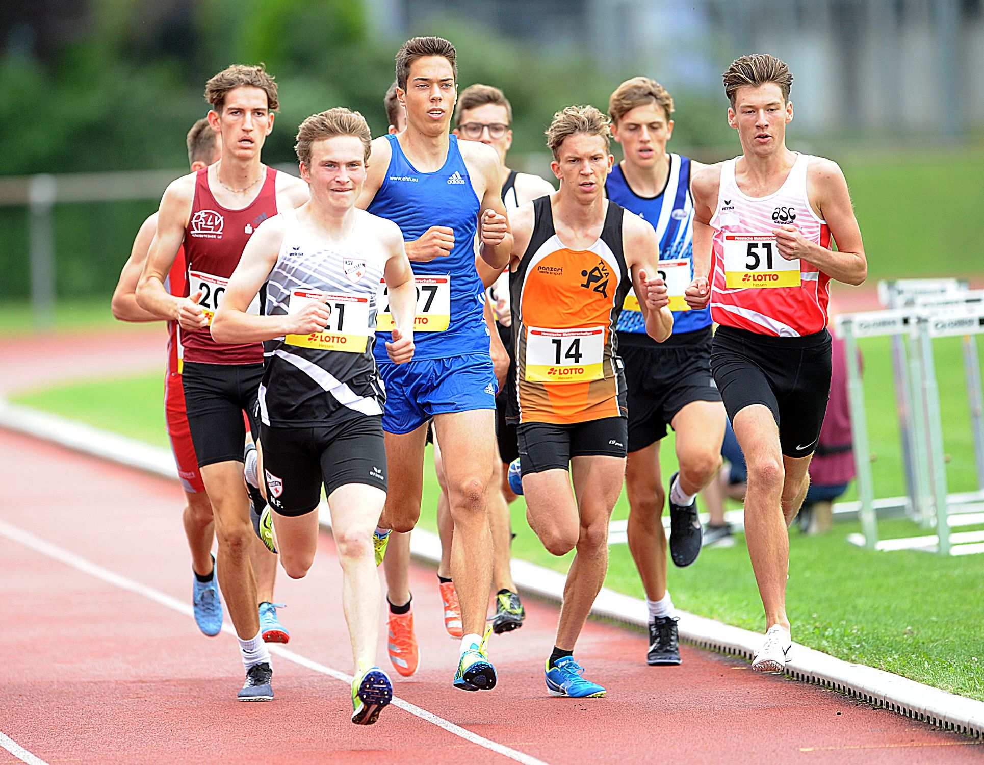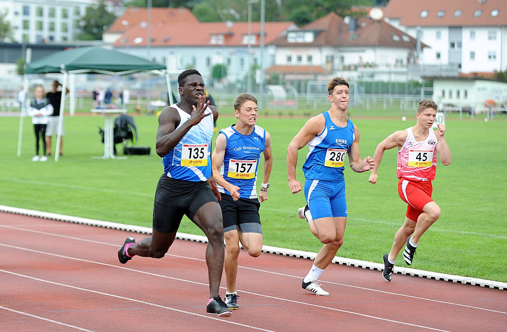 Der hessische Leichtathletik-Nachwuchs (U18) nutzte die Landesmeisterschaften in Gelnhausen als Generalprobe für die nationalen Titelkämpfe zwei Wochen später in Heilbronn. Richtig fit präsentierte Maximilian Grün (ASC Darmstadt), der im Hochsprung erstmals die zwei Meter bezwang und mit der Siegeshöhe von 2,02 Metern zum heißen Titelanwärter bei der DM avancierte. Sein Teamkollege Aaron Giurgian unterstrich mit starken 14,07 Sekunden über 110 Meter Hürden ebenfalls seine Gold-Ambitionen auf Bundesebene. Lokalmatador Juan-Sebastian Kleta (TV Gelnhausen) trug sich über 100 Meter (11,21 sec.) in die Siegerliste ein und holte mit 7,03 Metern im Weitsprung sein zweites Gold. Zwillingsbruder Juan-Esteban Kleta wurde in 23,53 Sekunden Dritter über 200 Meter und kam an Elias Maurer (TSV Amicitia Viernheim/23,32 sec.) nicht mehr vor bei. An der Spitze lief Aaron Amenta (TV Groß-Gerau) ein einsames Rennen. Das große Sprint-Talent gehört noch der jüngeren Altersklasse M15 an und zeigte in hervorragenden 22,01 Sekunden allen Gegnern die Hacken. Aaron wurde zudem noch Zweiter (11,33 sec.) über 100 Meter.