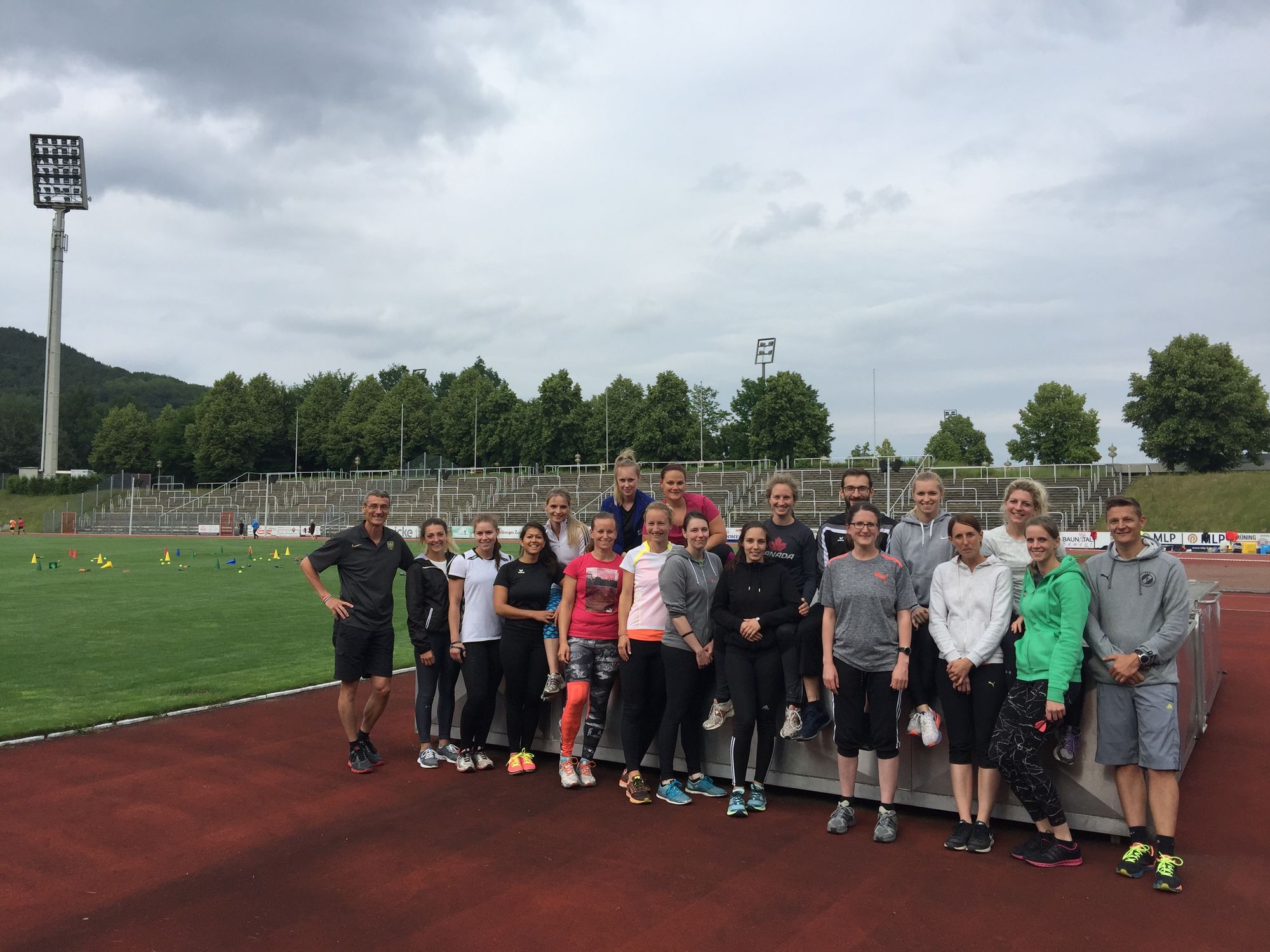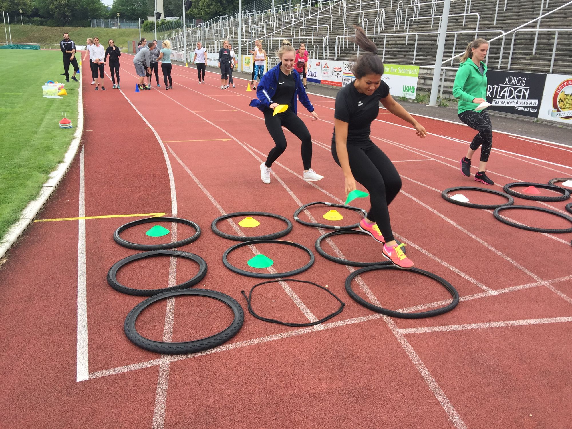 Nach einem kurzen theoretischen Überblick wurden einzelne Übungen und Spiele direkt im Baunataler Parkstadion ausprobiert. Für ein ganzheitliches Aufwärmen reichte dabei ein 6m x 6m Feld, auf dem durch unterschiedlichste Bewegungsaufgaben eine allgemeine und spezifische Erwärmung erreicht, sowie - zunächst ganz unbemerkt - auch die Freude an der Bewegung und dem Miteinander schnell geweckt wurde. Der Spaß stand im Laufe des Nachmittags immer wieder an erster Stelle: Die vielfältige Schulung der Basisfähigkeiten Laufen, Springen und Werfen, wurde meist verknüpft mit Aufgaben zu zweit oder im Team und war so motivierend und herausfordernd für alle. Die meisten Übungen kommen dabei ohne bzw. mit geringem Materialaufwand aus und auch Alltagsmaterialien wie Zeitungspapier kamen zum Einsatz. Bei Sprungkombinationen in Fahrradreifen, Reaktionssprints mit „Schere - Stein - Papier“, Staffeln, bei der Legotürme auf- und abgebaut werden oder „Tic - Tac - Toe“ im Großformat kamen auch die Referendare ins Schwitzen und es wurde viel gelacht. Mit vielen Ideen für die Umsetzung im Kopf und Dank an Dominic Ullrich stand am Ende als Fazit: Kinderleichtathletik lässt sich hervorragend in die Schule übertragen und ist im Sportunterricht - auch in der kleinsten Halle - umsetzbar.