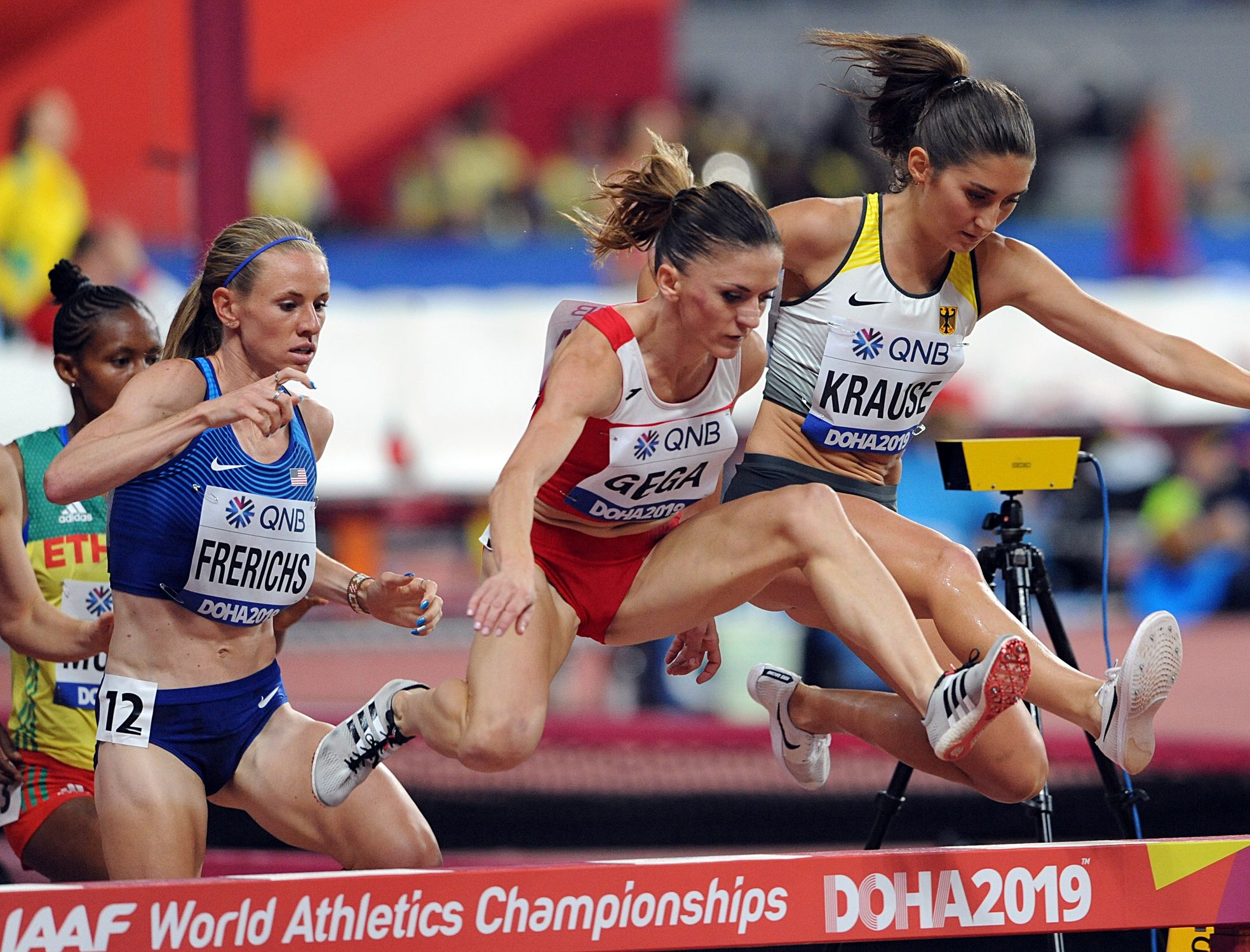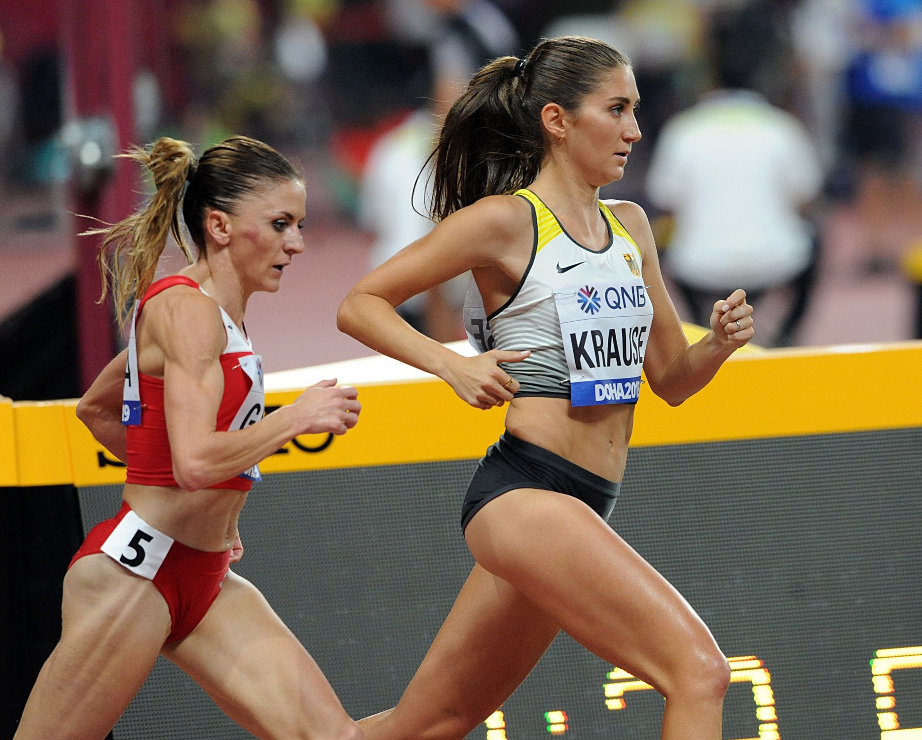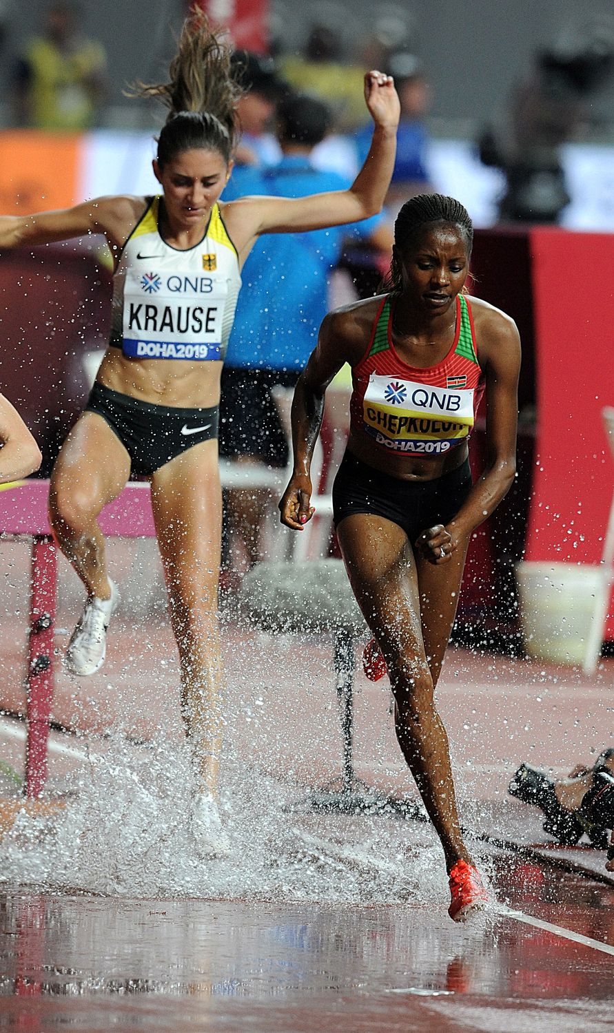 Pflichtaufgabe gelöst - jetzt kommt die Kür. So könnte man den Auftritt von Gesa Krause im Khalifa-Stadion beschreiben. Die Frankfurterin im Trikot von Sylvesterlauf Trier war im zweiten von drei Vorläufen über 3000 Meter Hindernis, der dann auch das schnellste Rennen werden sollte. Am Ende stürmten hier gleich ein Quartett innerhalb von einer Sekunden über die Ziellinie. Den Anfang machte die WM-Favoritin Beatrice Chepkoech (KEN) mit 9:18,01 Minuten, gefolgt von Courtney Frerichs (USA) in 9:18,42 Minuten, Gesa Krause (9:18,82 min.) und der Landesrekord laufenden Dänin Anna Emilie Möller (9:18,92 min.).