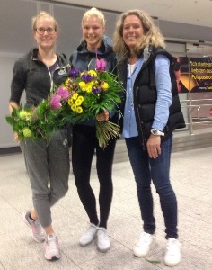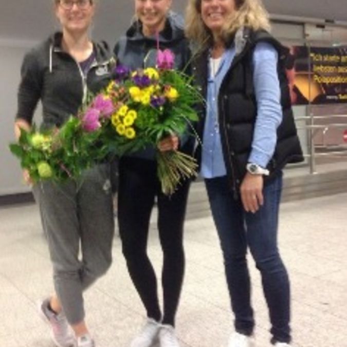 Blumensträuße und das offizielle HLV-Notizbuch im Großformat: Der Hessische Leichtathletik-Verband hat mit Geschäftsstellenmitarbeiterin Gudrun Rouhi seine erfolgreichen WM-Sprinterinnen Lara Matheis (TSG Gießen-Wieseck) und Lisa Mayer (Sprintteam Wetzlar) am Frankfurter Flughafen persönlich empfangen. Die Olympiavierte Lisa Mayer hatte bei den sogenannten World Relays, den Staffel-Weltmeisterschaften in Nassau auf den Bahamas, mit der deutschen 4x100-Meter-Staffel in 42,84 Sekunden den Titel gewonnen. Dahinter platzierten sich Jamaika (42,95 Sekunden) und China (43,11 Sekunden). Die mitfavorisierten Amerikanerinnen waren bereits in der ersten Kurve aus dem Rennen, da Startläuferin Tianna Bartoletta stürzte. Tags zuvor war Lara Matheis mit der 4x200-Meter-Staffel des DLV zur Silbermedaille gesprintet. Das deutsche Quartett mit Lara Matheis als Startläuferin, Tatjana Pinto (LC Paderborn), Rebekka Haase (LV Erzgebirge) und Gina Lückenkemper (LG Olympia Dortmund) lief 1:30,68 Minuten. Schneller war nur die Staffel aus Jamaika (1:29,04 Minuten). Im 4x200-Meter-Vorlauf waren sogar beide Hessinnen im Einsatz gewesen, in diesem Rennen hatte Lisa Mayer einen fulminanten Schlussspurt auf die Bahn gelegt. (tin.)