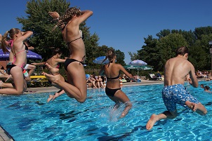 Tag 1 – 23.08.2016 – Camp 2 – Juliane Am ersten Tag des 2. Camps kamen wir zwischen 11 und 12 Uhr in Alsfeld an. Nachdem wir Namensschilder gebastelt und einige Kennenlernspiele gespielt hatten, aßen wir Hähnchenspieße und Reis zum Mittagessen. Danach mussten wir uns schnell umziehen, um zum Sportplatz zu joggen. Auf dem Sportplatz trafen wir die Sportler aus Camp 1, die ihr letztes Training zusammen mit uns ausführten. Dann trainierten wir gemeinsam mit den beiden HLV-Topathleten Xenia Stolz und Mark Reuter in zwei Gruppen, entweder Weitsprung oder Mittelstrecke. Im Anschluss hatten wir die Möglichkeit den beiden Fragen zu stellen und uns Autogramme zu holen. Wieder in der Unterkunft angekommen, wurden die Zimmer verteilt. In den Zimmern wollten sich alle duschen und sich umziehen, um frisch und pünktlich beim Abendessen zu erscheinen. Zum Abendessen gab es Brötchen mit verschiedenen Belägen und Brezeln. Am Abend spielten wir weitere Kennenlernspiele, damit wir einander besser oder neu kennen lernen konnten. Anschließend besprachen wir die Campregeln und verteilten die Camprollen. Schließlich gingen wir alle in unsere Zimmer und irgendwann dann auch schlafen, um mehr oder weniger ausgeruht in den nächsten Tag zu starten. Tag 2 – 24.08.2016 – Camp 2 – Elena Um 7:30 Uhr begann auch für das 2. HLV-Camp der erste komplette Tag in Alsfeld. Während die einen frisch und motiviert in den Tag starteten, war den anderen eine kurze Nacht anzusehen, als wir alle zusammen zum Geländelauf aufbrachen. Dieser hatte das Ziel die Umgebung zu erkunden, in der wir die nächsten 3 Tage verbringen werden. Dementsprechend ging die Strecke über Parkplätze, kleine Wege und vorbei an LKW-Anhängern. Das anschließende Frühstück gab uns die Chance, uns für weitere Anstrengungen zu stärken. Um 9:10 Uhr begann dann die erste Trainingseinheit auf dem Sportplatz nahe der Unterkunft. Das Programm stellten dabei verschiedene Sprints dar. Beginnend mit Dehn- und Koordinationsübungen steigerten wir das Training bis hin zu 150m Sprints. Bei einem der Sprints wurde die Zeit gestoppt, um diese für das Sportabzeichen einzubringen, welches wir am Ende der gemeinsamen Woche absolviert haben sollten. Als unsere Motivation mit voranschreitender Zeit und Anstrengung nachließen, haben wir alle zusammen gesungen, um uns gegenseitig anzufeuern und unsere Gruppengemeinschaft zu stärken. Nach dem Training waren wir umso glücklicher, bis zum Mittagessen um 12:30 Uhr noch eine dreiviertel Stunde zur freien Verfügung zu haben. Nach zahlreichen Spekulationen, was es wohl zum Essen gibt, lagen wir mit Spätzle und Fleisch gar nicht so falsch. Doch die Pause dauerte nicht lange: Wegen den 28 Grad und Sonnenschein, die uns den Tag über begleiteten, trafen wir uns um 13:15 Uhr, um gemeinsam zum Freibad zu gehen. Auch dort stand das Sportabzeichen wieder im Mittelpunkt: 15 min Dauerschwimmen. Anschließend nutzen wir die Zeit bis 17 Uhr zum Springen vom 5-Meter-Turm, zum Beach-Volleyball spielen oder zum Synchronspringen vom Beckenrand.